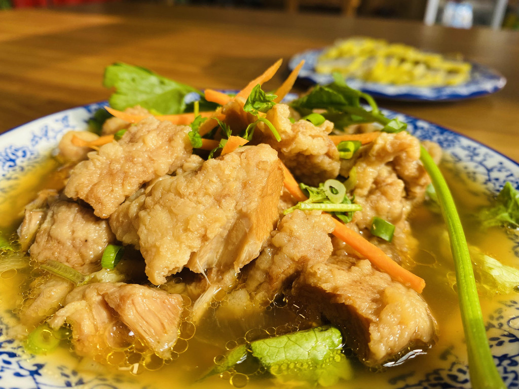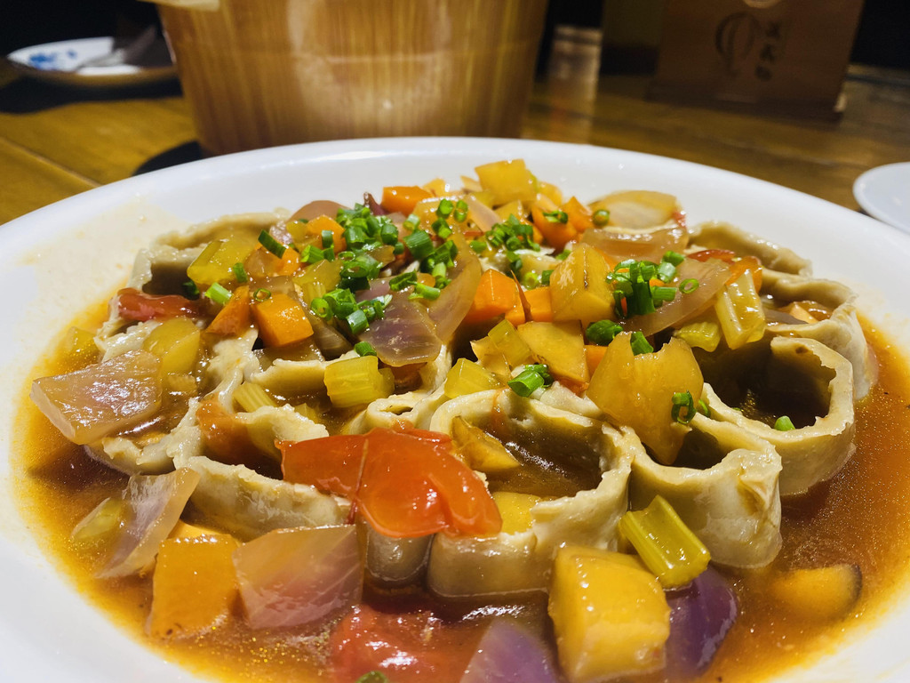 算是一道美食,马蜂窝的形状,上面的汤汁有八中食材,上菜之后,阿姨非常贴心的帮我们分开,简直不要太好,吃一口,芳香四溢,很有嚼劲!
