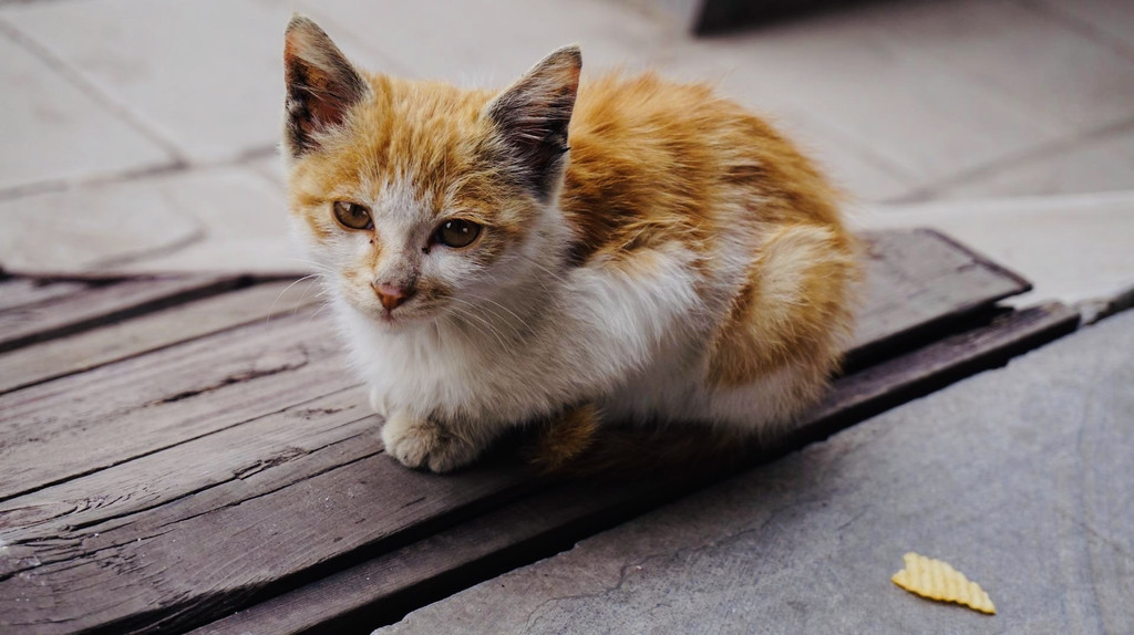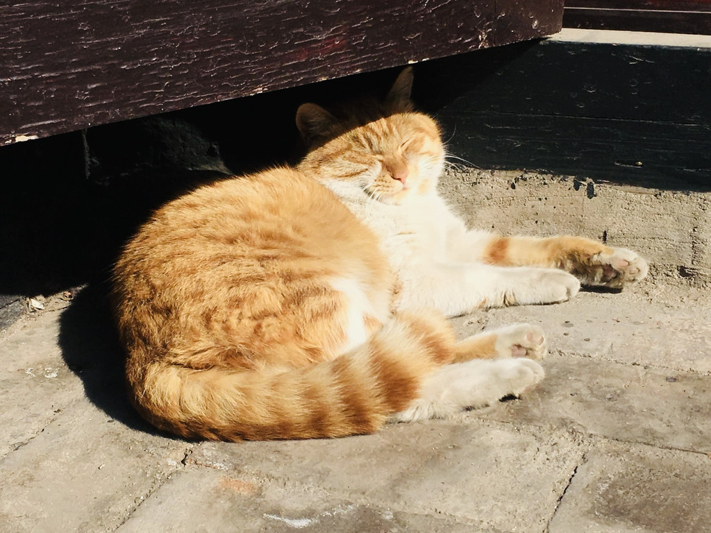 夕阳时分,温柔的光线照在路边小猫的身上。