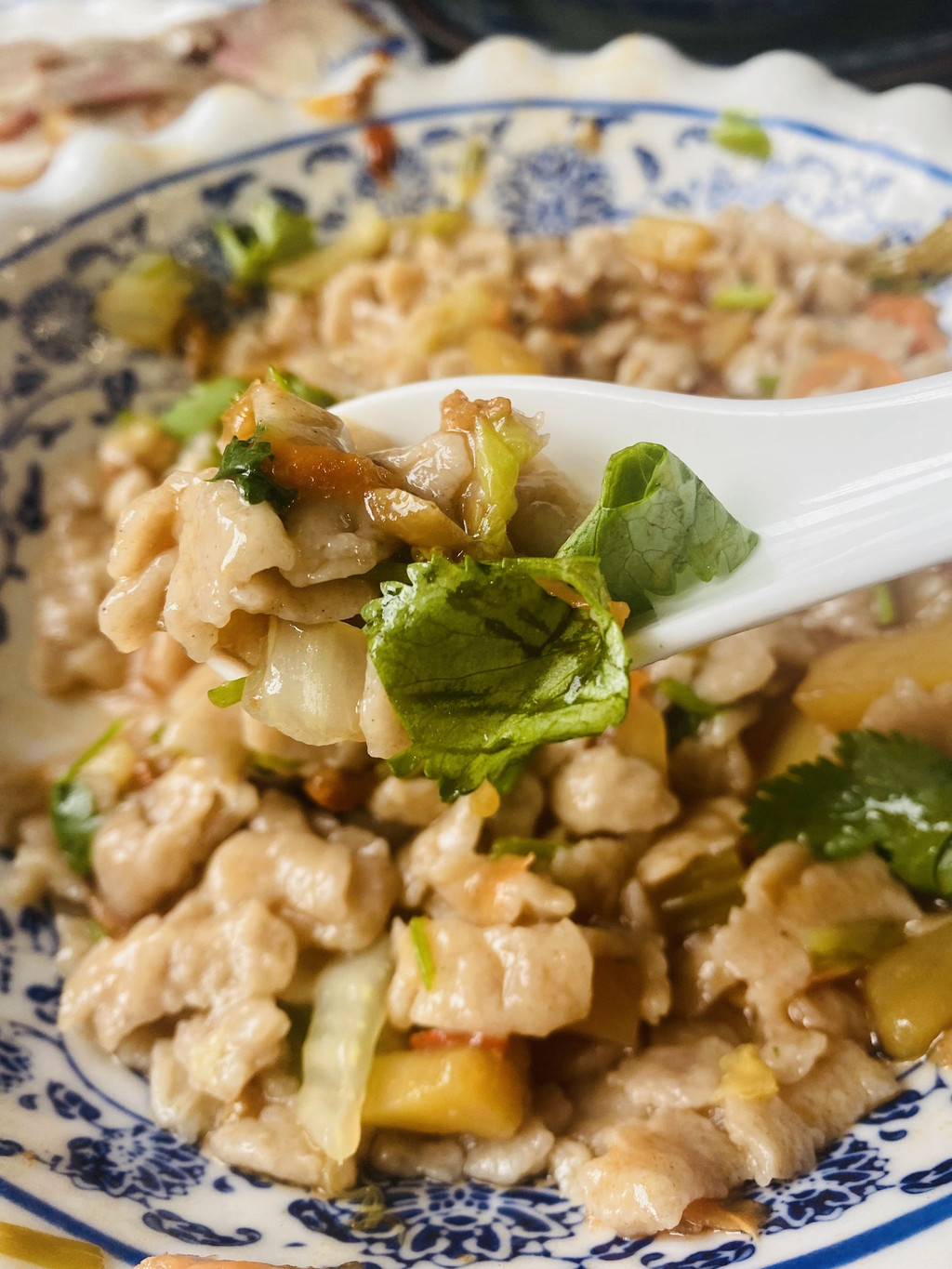 阳阳一直想要吃平遥的炒碗托,那么竟然我们来了平遥,当然是要吃正宗的炒碗托了,于是就和阳阳找到了这家董记炒碗托店,逛的时候路过就看见他们家人挺多的,点了牛肉烤肠炒碗托,还有一碗桃花面,面的份量很足,面条也很劲道,碗托和面都很合胃口,推荐给大家,集美们可以尝一尝他们家的油茶哦,吃碗托的时候一定要配一碗汤!