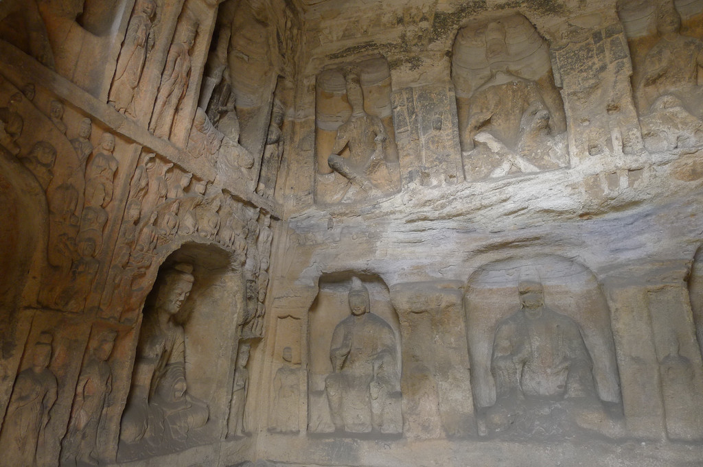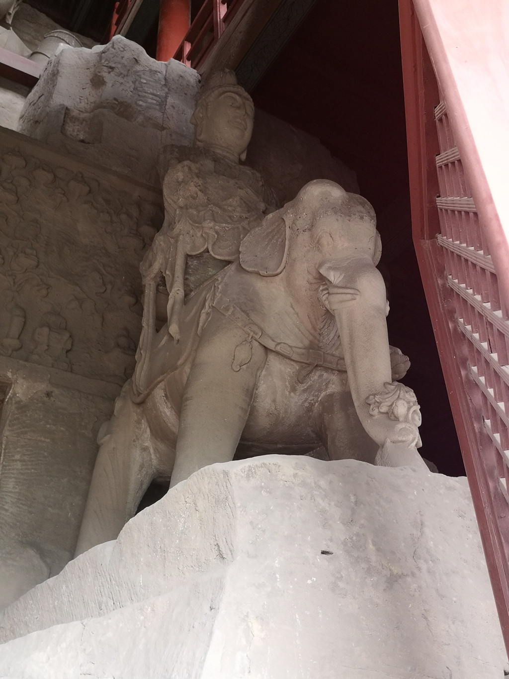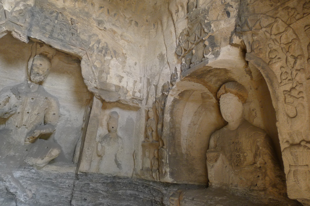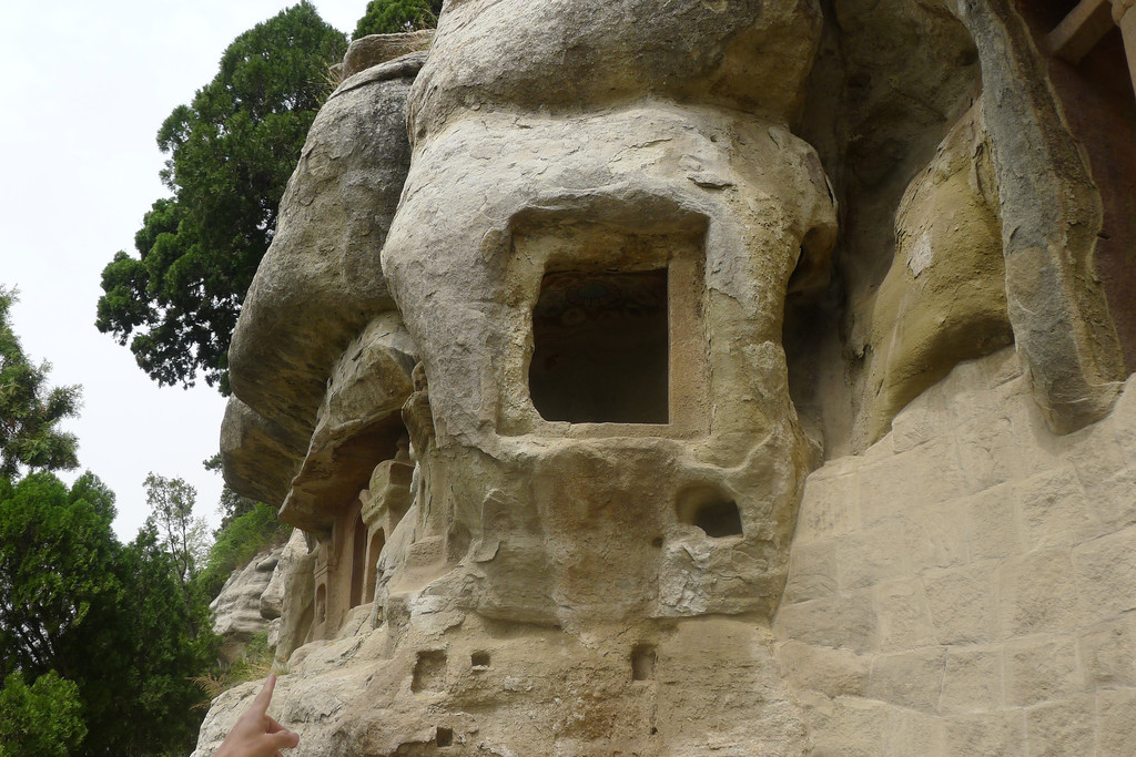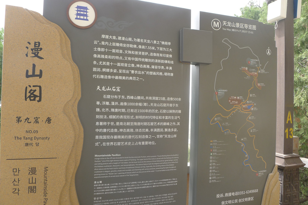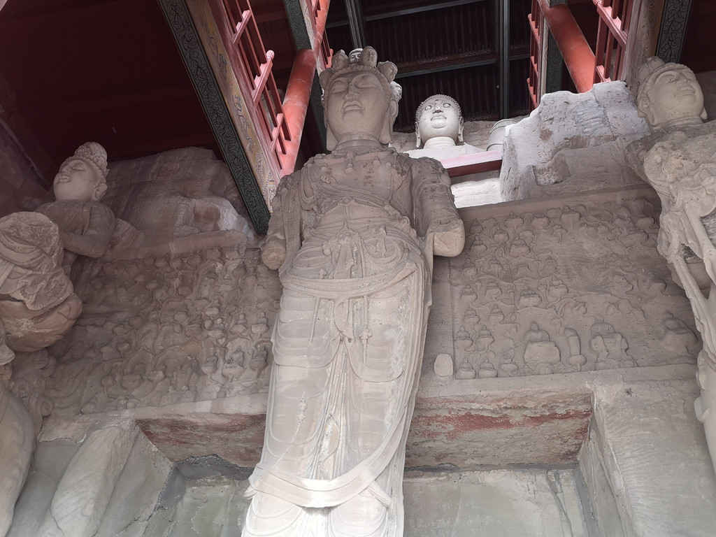 与其他石窟景区不同,天龙山石窟内少有完整、无损无缺的石像,原因在于近代战乱时天龙山石窟遭受了较为严重盗凿,很多佛像仅剩佛身;加之经千年风雨侵蚀,石像风化十分严重,不少石像轮廓、表面已模糊看不到细节,甚至辨认不出原本模样(比如我把一石窟的石狮看成了石猴)。天龙山东西峰石窟间的漫山阁(第九窟)及其里面的雕像,虽是现代重建,却相当震撼。佛像雕塑既伟岸高雅,又圆润多姿,特别是11面观音之精致让人难忘。