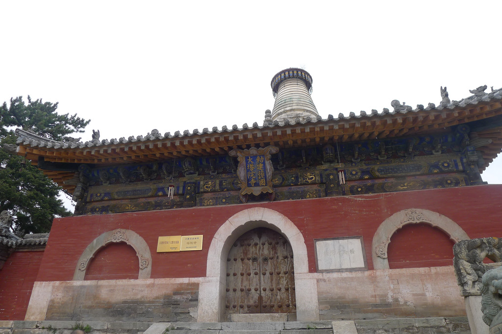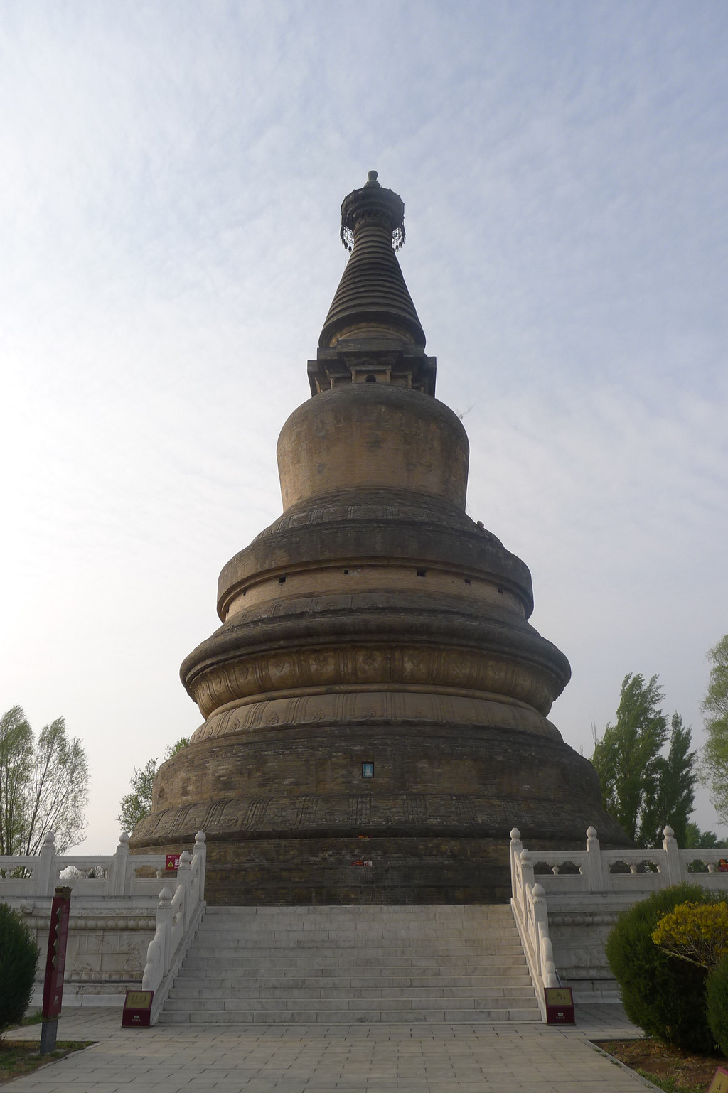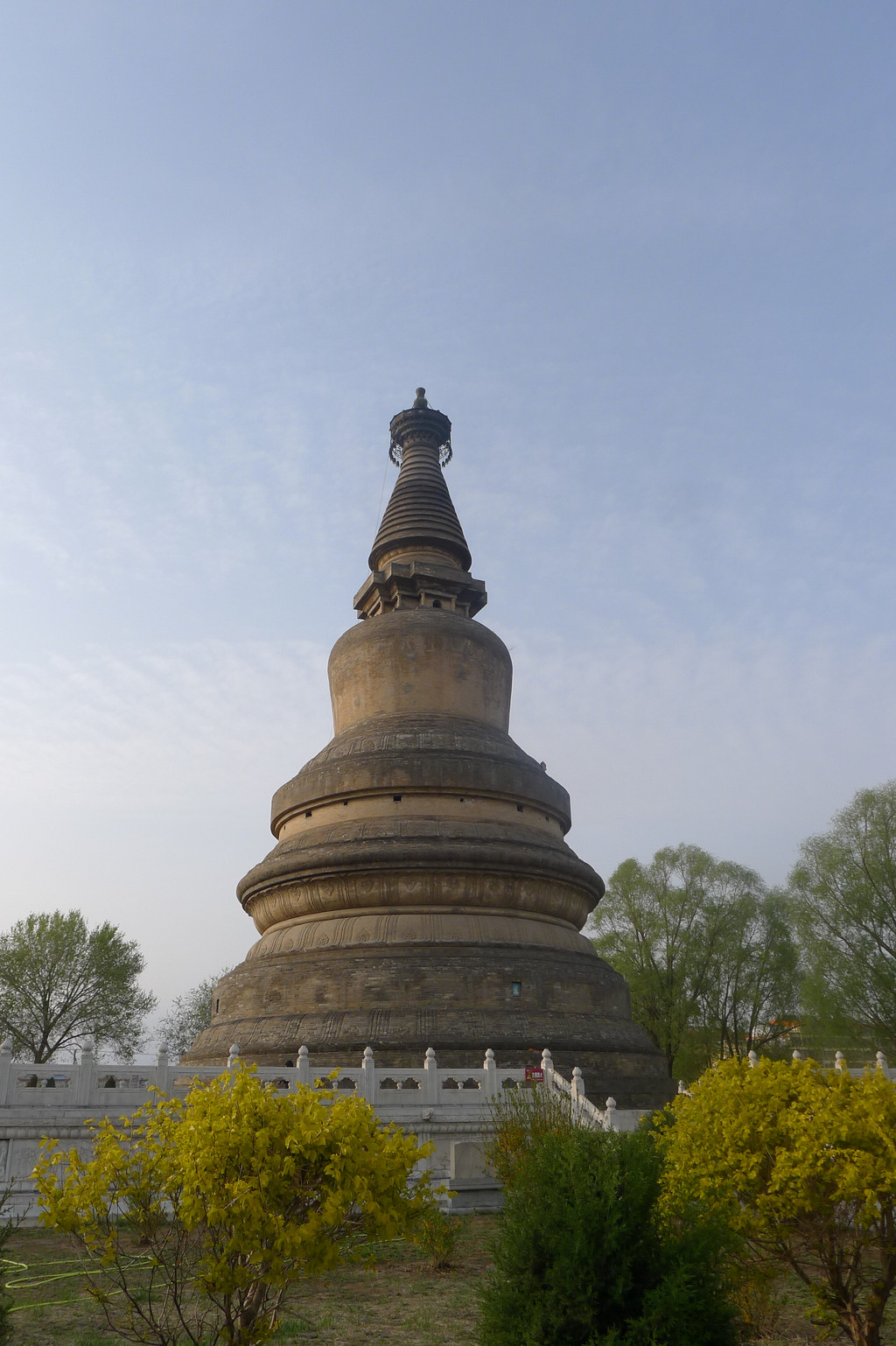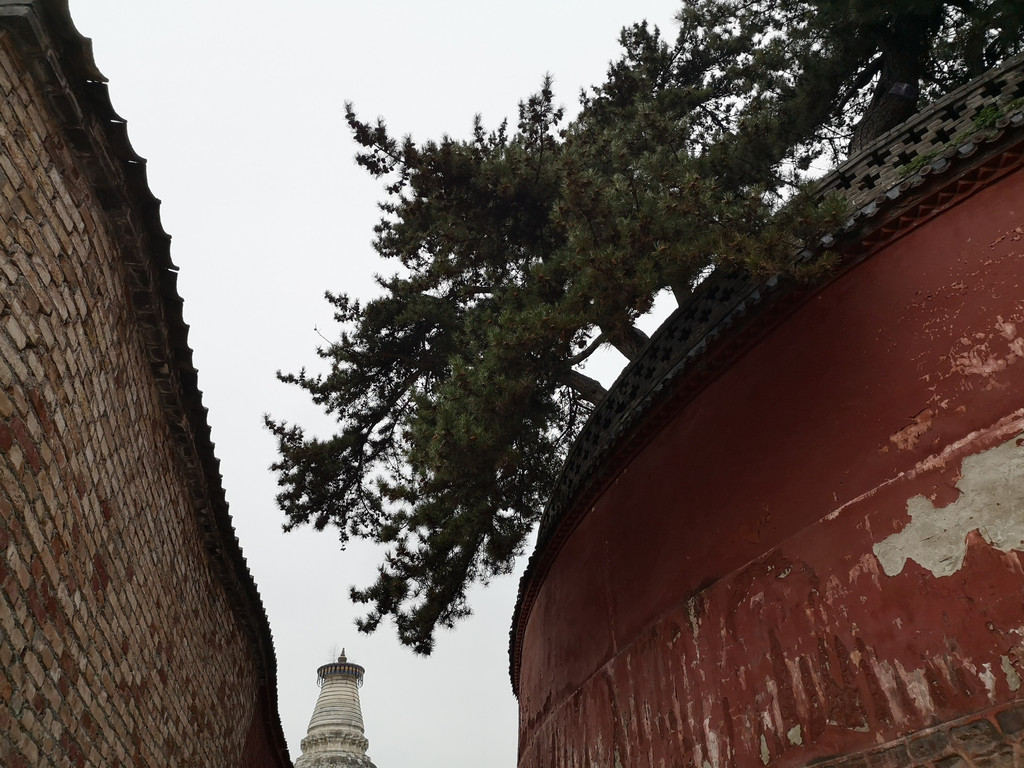 阿育王塔原为木结构,元时改建为砖塔。覆钵式的阿育王塔,属藏式喇嘛塔形制,整体造型秀美挺拔,是我国藏式塔中的佳作。塔台基上刻有仰覆莲瓣、缠枝花纹及印度的“陀罗尼经”(我在塔下仔细观看未能看出来,可惜),这是喇嘛塔中少见的雕刻方式。