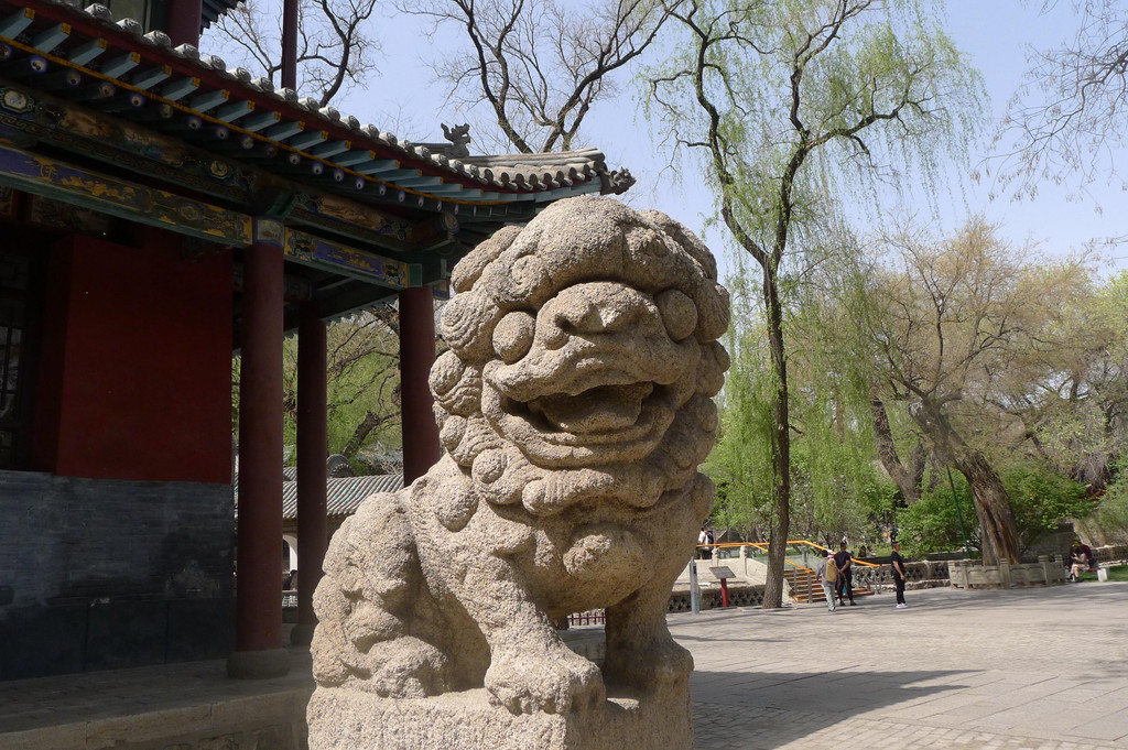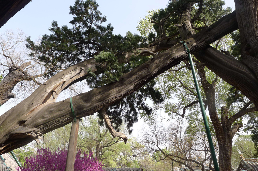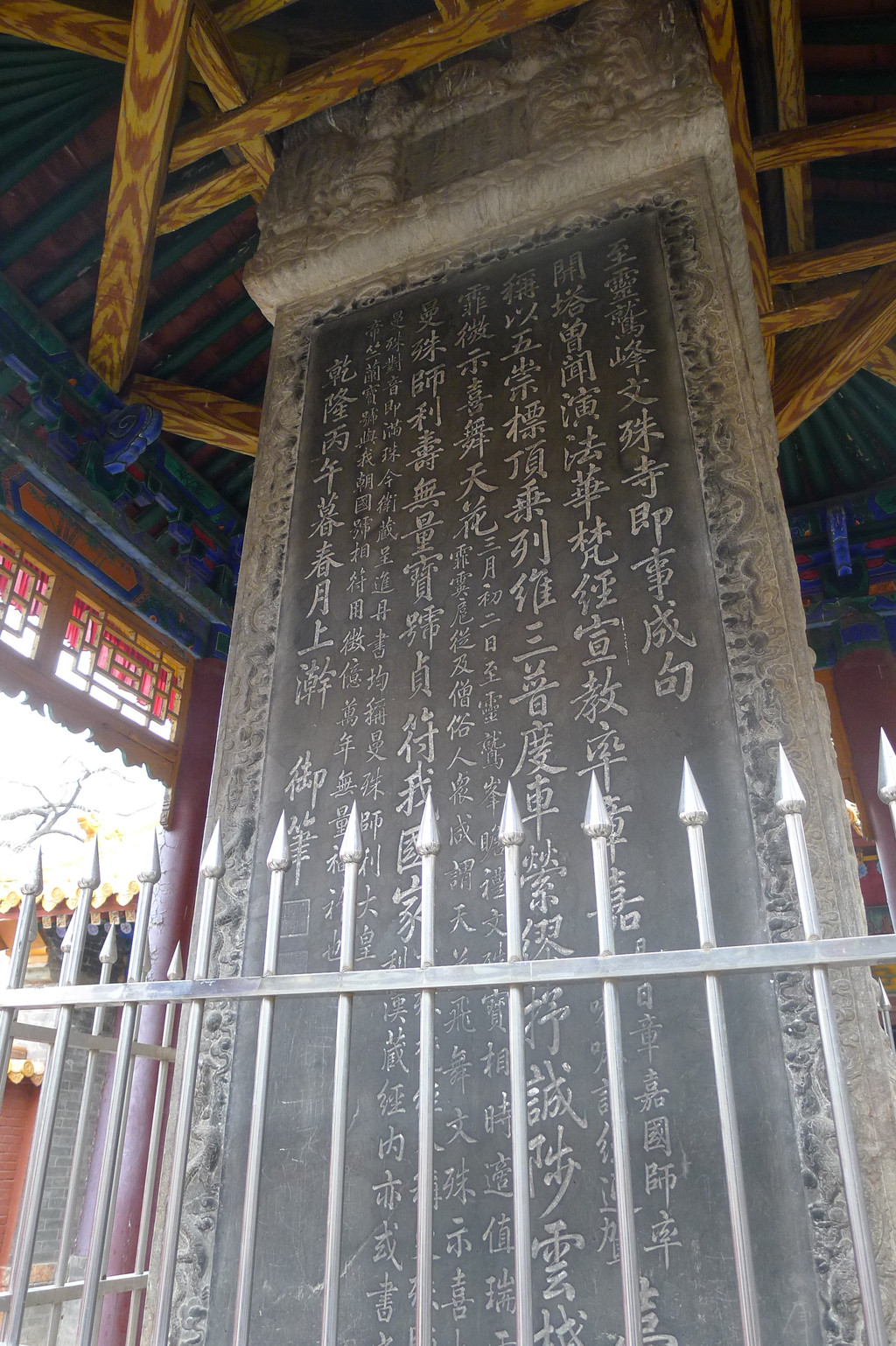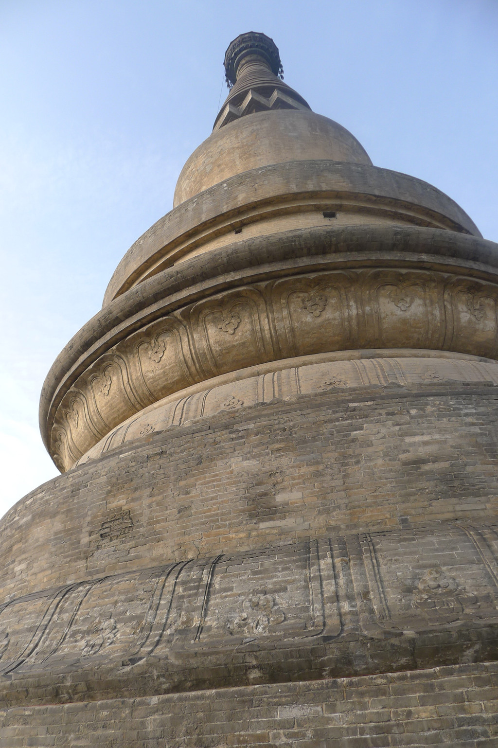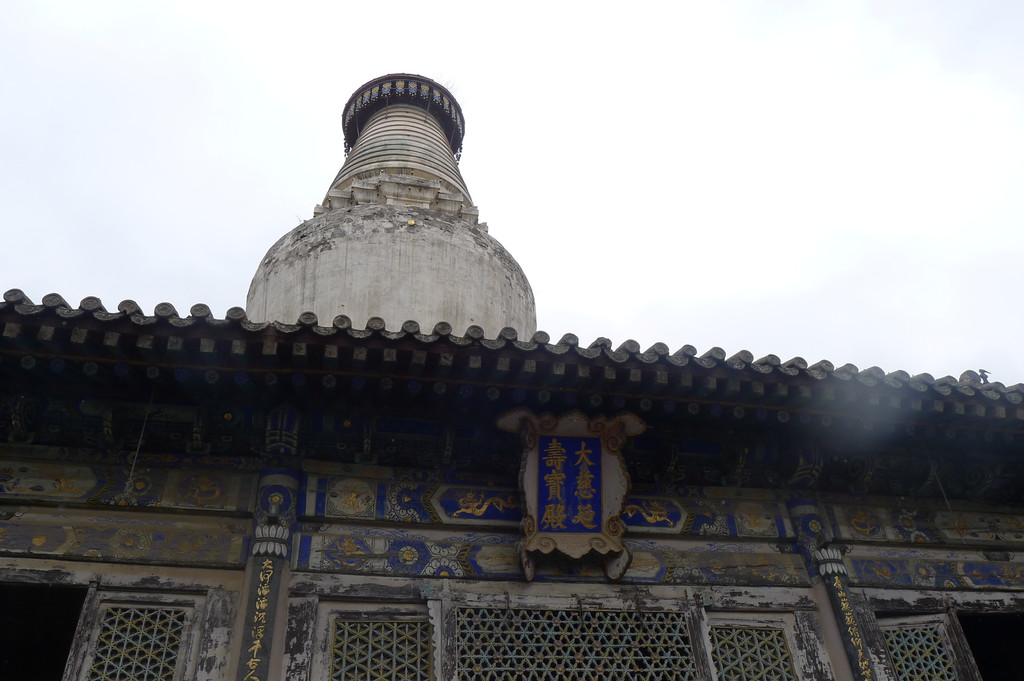 阿育王塔原为木结构,元时改建为砖塔。覆钵式的阿育王塔,属藏式喇嘛塔形制,整体造型秀美挺拔,是我国藏式塔中的佳作。塔台基上刻有仰覆莲瓣、缠枝花纹及印度的“陀罗尼经”(我在塔下仔细观看未能看出来,可惜),这是喇嘛塔中少见的雕刻方式。