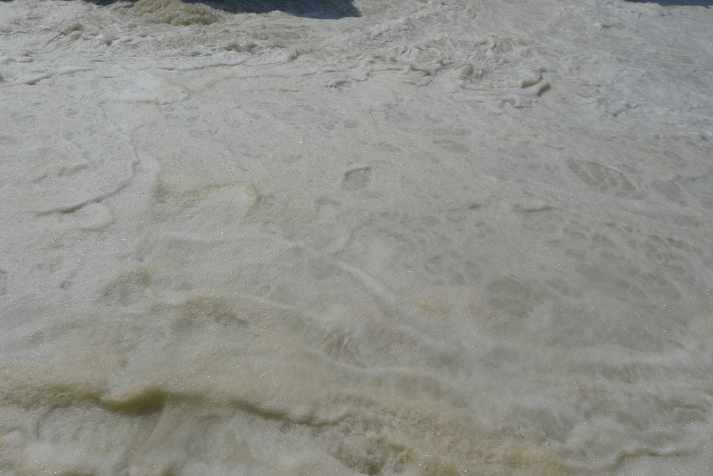 多年来持续的生态保护,让黄河水的颜色越来越浅,现在的水色像浅浅奶茶色。水迅速下落而形成的泡沫,像极了奶泡。