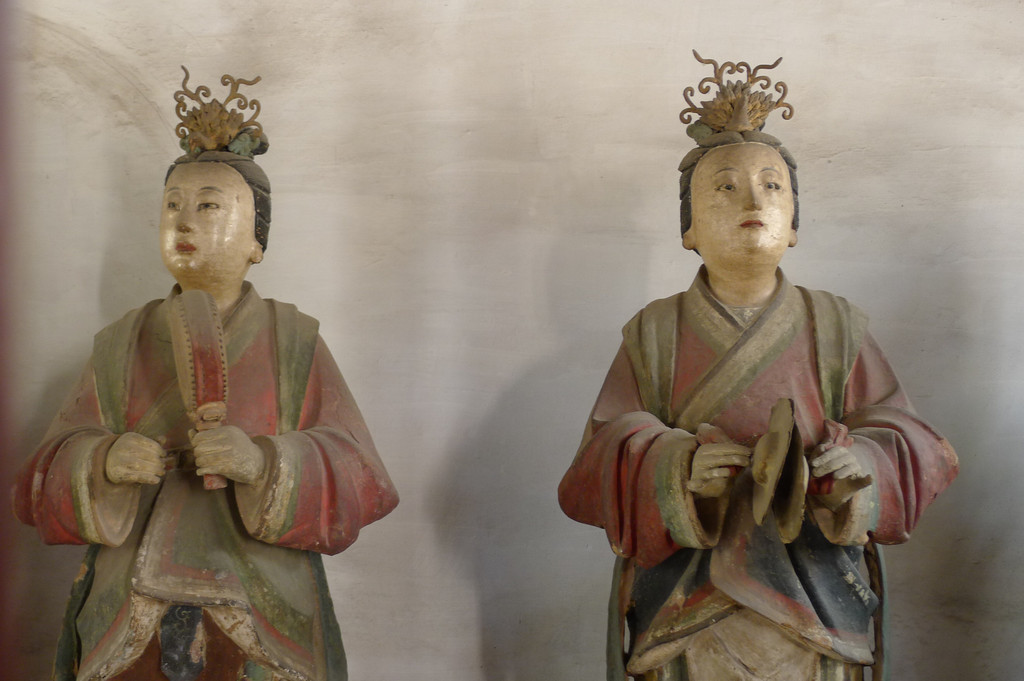 初看“东方彩塑艺术宝库”这个比喻,很难想象这个寺庙里的塑像到底技艺高超到何种程度,可能还会怀疑这个形容是否名副其实,但我相信去过的人一定会认可这个称号。双林寺的彩塑——佛像、天王、菩萨、市井百姓等各类人物神态表情、动作姿态栩栩如生,衣服、发型、冠饰等精致入微——完美呈现出人物或慈善或凶狠或严肃或丑陋的形象。飞禽走兽、山川云彩同样逼真,它们往往在人物塑像身后,层层叠叠,展现着一个真实的世界。