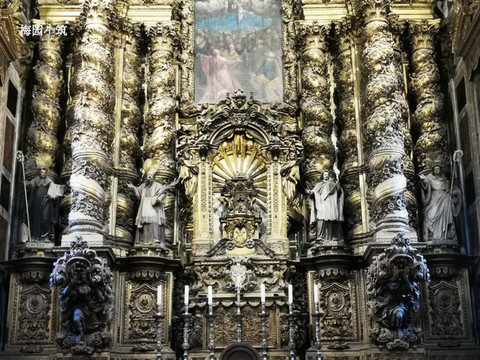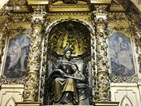 据说,教堂的大范围整修开始于18世纪上半叶,内部的墙壁、横梁、柱子等都使用了大量的鎏金工艺,据统计用了大约400公斤黄金。让教堂看上去非常金碧辉煌,尤其是阳光透过玫瑰花窗照进来的时候,整个教堂充满华丽的神圣感,而历经几百年的岁月流逝,天使雕像的翅膀上金箔已然剥落,露出底层的石膏,宛如褪色的荣耀。