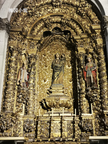 走进沉重的橡木门,光线就暗了下来。片刻后,等适应了光线,才猛然发现这教堂中殿的拱顶竟然也有些低矮压抑,全然没有西班牙教堂那种挑高设计,中殿保留了原始的罗马式骨架,厚重的石墙和简朴的拱顶重现了12世纪的教堂,让人想起中世纪修道院僧侣们压低嗓音的祷告。阳光从侧窗斜射进来,照见空气中浮动的尘埃,像被惊醒的历史碎片。教堂顶部是简化的筒形拱顶,线条粗犷,与后期奢华的装饰形成鲜明对比。主祭坛通体覆盖繁复的金叶雕刻,以漩涡纹、葡萄藤和天使像为主题,金色巴洛克装饰在阴影中闪烁,那是18世纪添加的“妆容”,覆盖了原本的严肃。