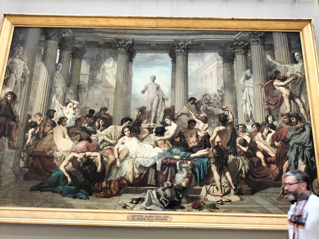 这个作品展现了罗马的堕落的原因,背后的建筑是曾经的辉煌,但如今已经纸醉金迷。这个和我国的《韩熙载夜宴图》思想有些接近。