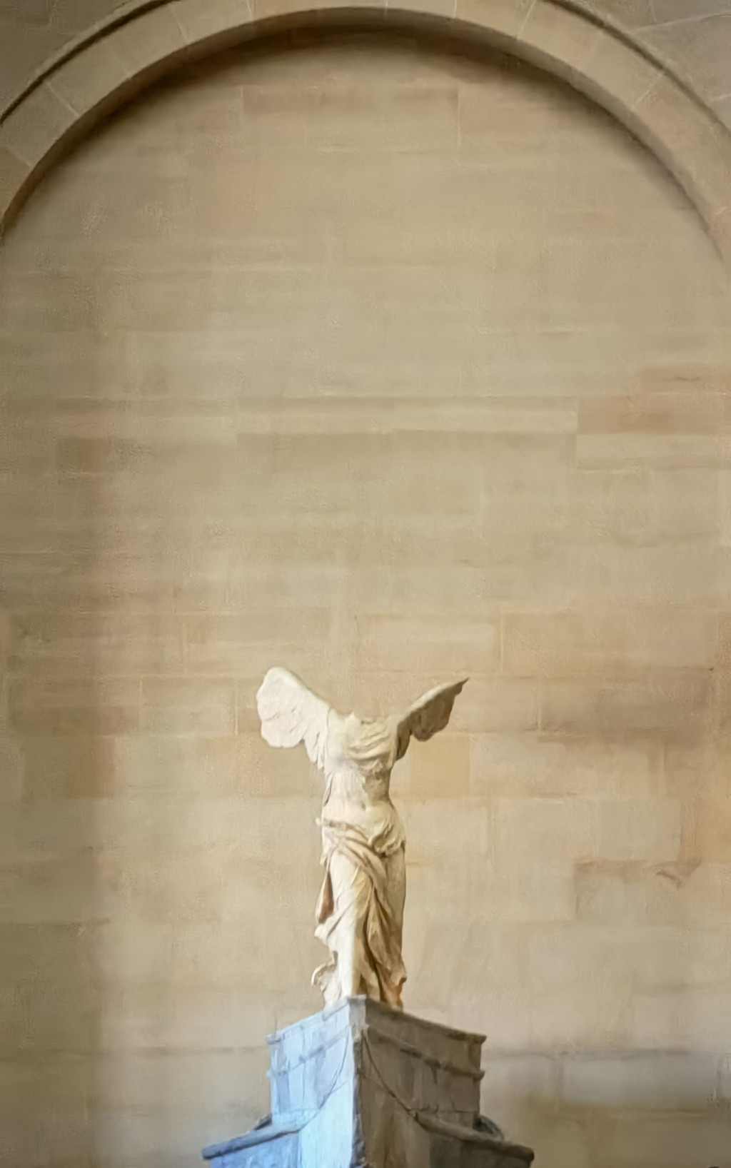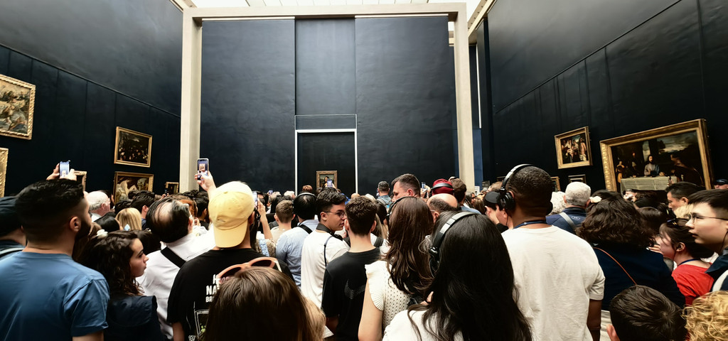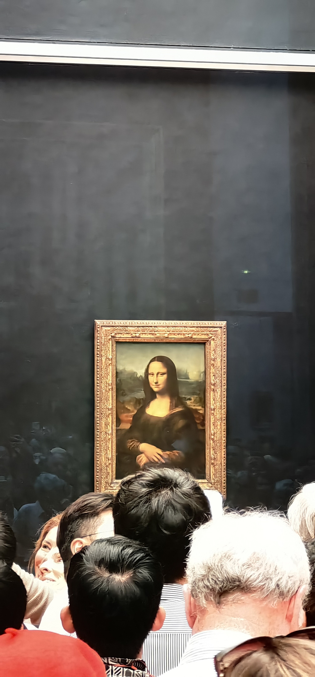 镇馆之宝达芬奇的《蒙娜丽莎》,文艺复兴的代表作。果然是人气旺盛,我们完全挤不进去。《蒙娜丽莎》以前老师讲过达芬奇打破中世纪画神的习惯而画了一个普通的妇女,首次突破禁忌画到腹部以下,突破旧思想,提倡关注人。此外蒙娜丽莎的眼睛很有趣,无论你站在那儿,她好像都在看你。