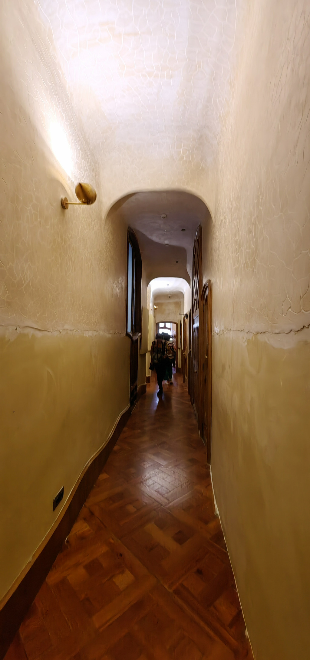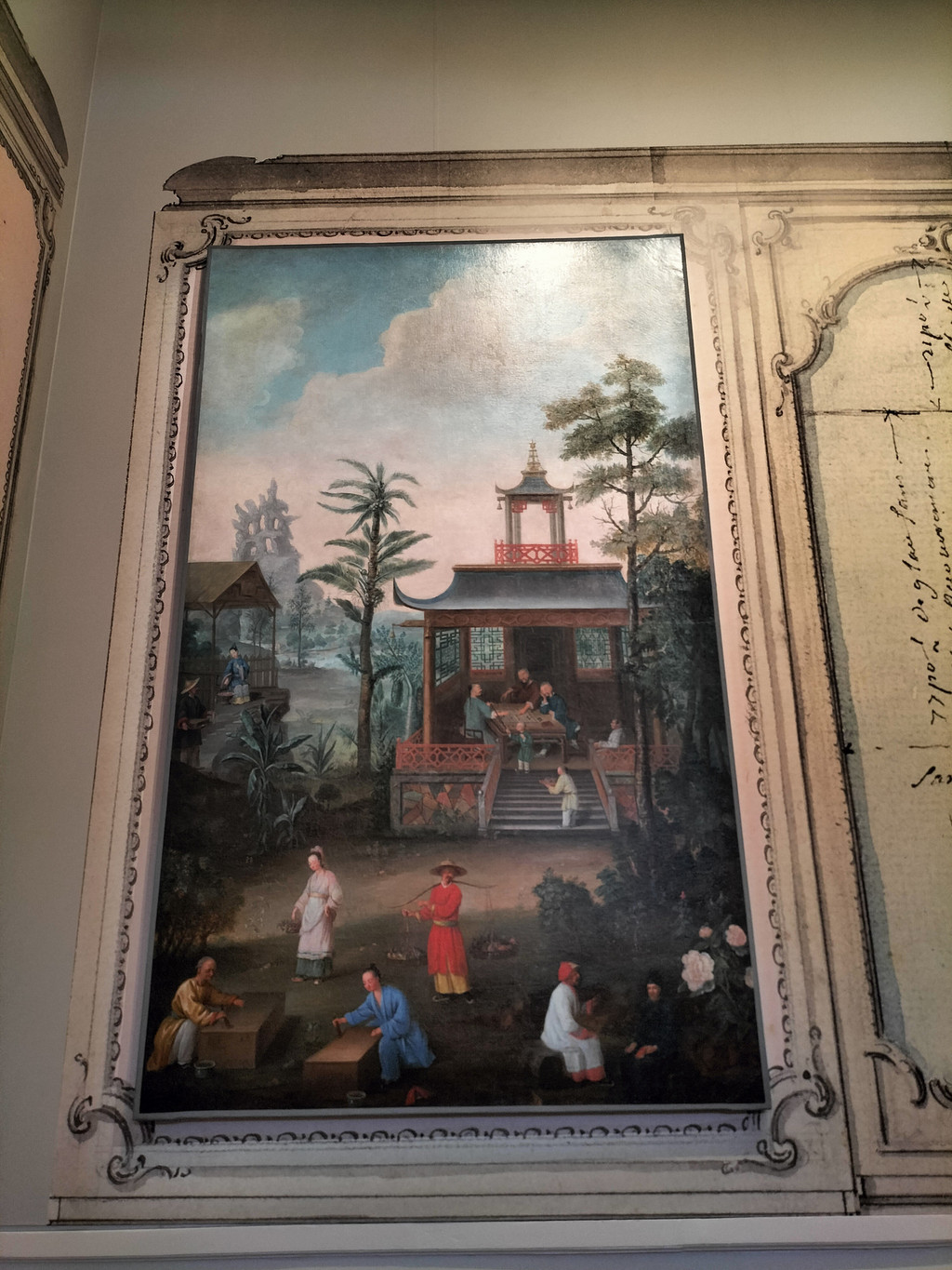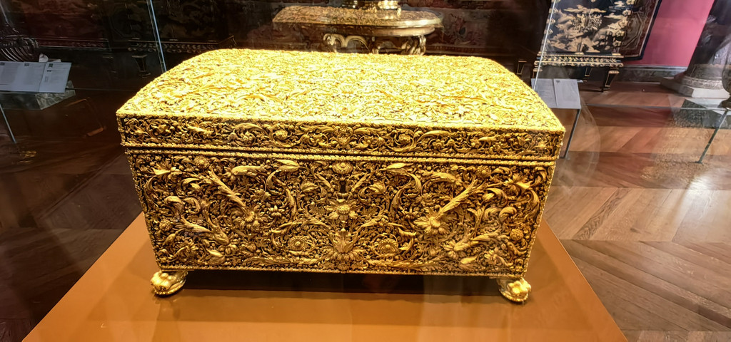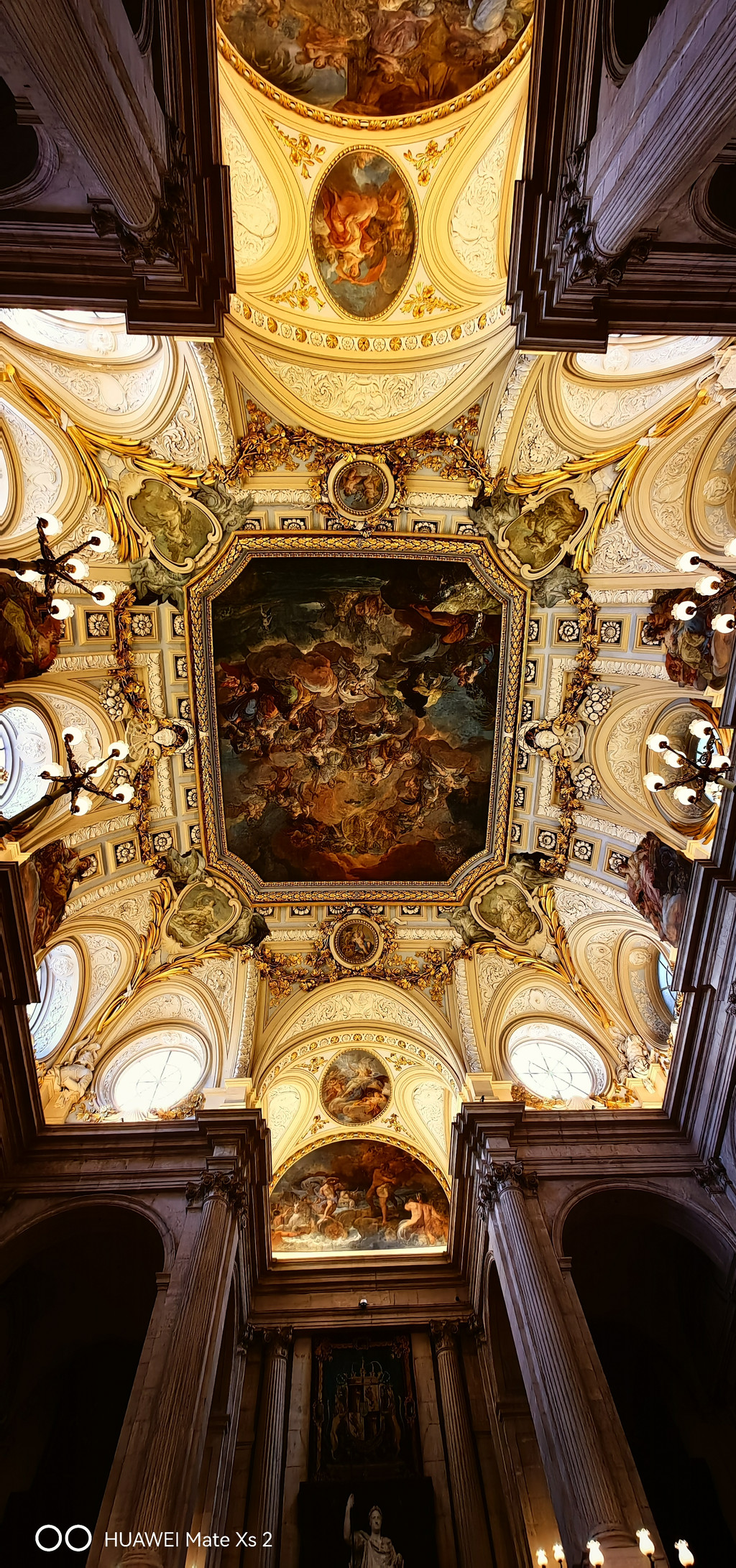 里面有很多房间,功能和装修都和凡尔赛宫有些相似。印象很深的有宴会厅,听闻是国王接见外来国家领导人聚会的地方,宴会厅全部用金子装饰,整个房间金光闪闪,尽显奢华之风。讲解员说地面上那些弯曲形状各异的地砖都是手工打磨平凑的,可以说即使是放在现代工艺也相当复杂。有一个房间天花顶部还有中国故事的壁画。