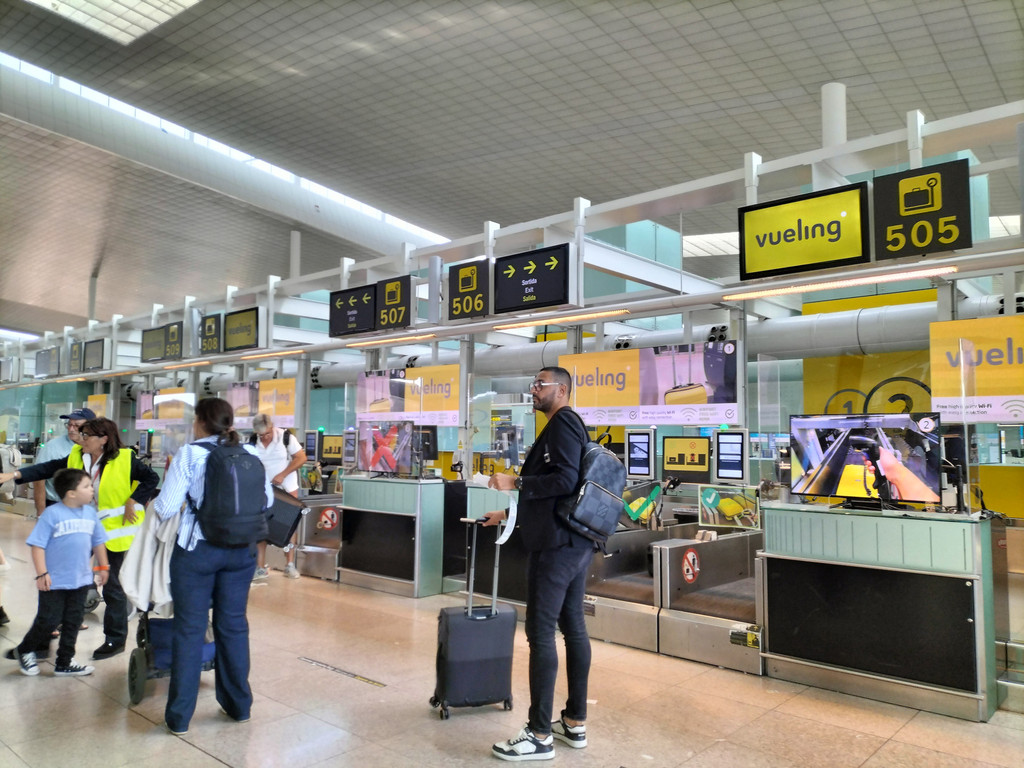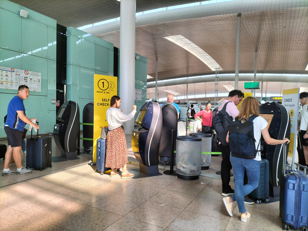 巴塞罗那机场。值得一提的是,从机场真的都能看到欧洲的发达,机场都是自助取票,或电子票登机,还有自动打包行李,少部分人工打包,这样一来减少人工成本,办事效率也很高。
