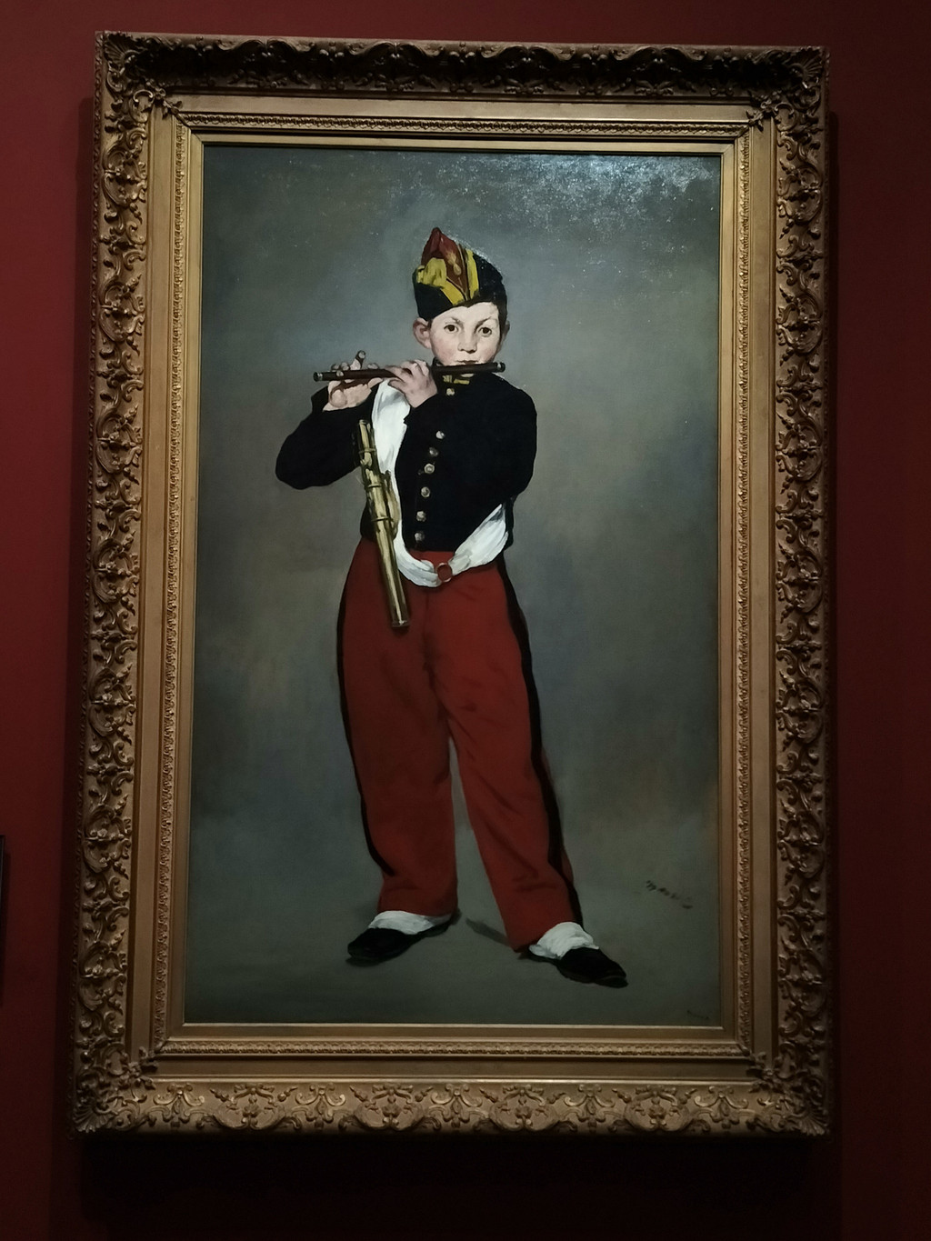 马奈的《吹笛少年》,首次画人物没有背景,没有地面,不知道是站在哪儿里,开启了绘画的一个新维度。