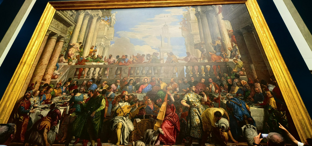 这个作品是委罗奈斯的《迦拿的婚礼》讲的是耶稣和门徒一起参加一对新人的婚礼,耶稣施法把水变成了酒。但是有趣的是,新人坐在最左下角看着我们,他们没有在中间而是次要位置,体现的是对来宾的尊重。正中间头上发光的是耶稣。