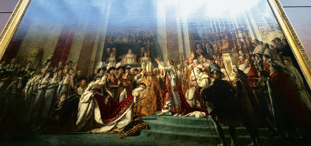 拿破仑的加冕,画中拿破仑忽略教皇(他背后坐着的就是教皇)自己加冕,体现他的权势。另外中间坐着的老太太是他的母亲,但其实当时已经去世了,画家为讨好拿破仑而画的。