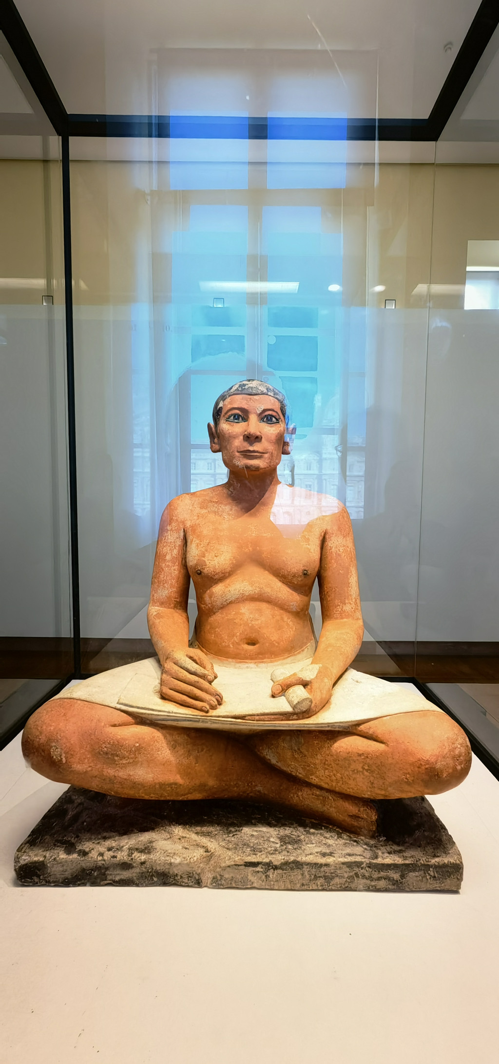 这个是盘腿而坐的书吏,他正在记录。是古埃及的文物。