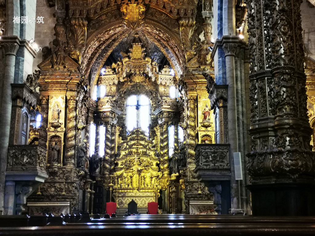 第二天一早,驱车赶往圣方济大教堂,葡萄牙的路大多狭窄,市中心的大道稍为宽阔些,却也容不下两辆汽车并行。电车轨道嵌在路中央,老旧的电车摇晃着驶过,发出刺耳的摩擦声。游客们挤在电车里,脸贴着玻璃,向外张望。而本地人则站在路边,面无表情地看着这些闯入者,眼神中既无欢迎也无厌恶,只是漠然。映着着阴郁的天气,让人想要深深叹出一口浊气来。圣方济各大教堂是波尔图最突出的的哥特式建筑,并以其内部极尽奢华的巴洛克式装修而闻名于世,是波尔图老城区世界遗产的一部分。从16世纪开始,随着葡萄牙的美洲殖民地不断扩张,这座教堂也被赞助者们不断装修,到18世纪,那些多得用不完的黄金镀满了教堂的墙壁、柱子、屋顶,教堂内部装修成了天下最奢华的巴洛克风格。