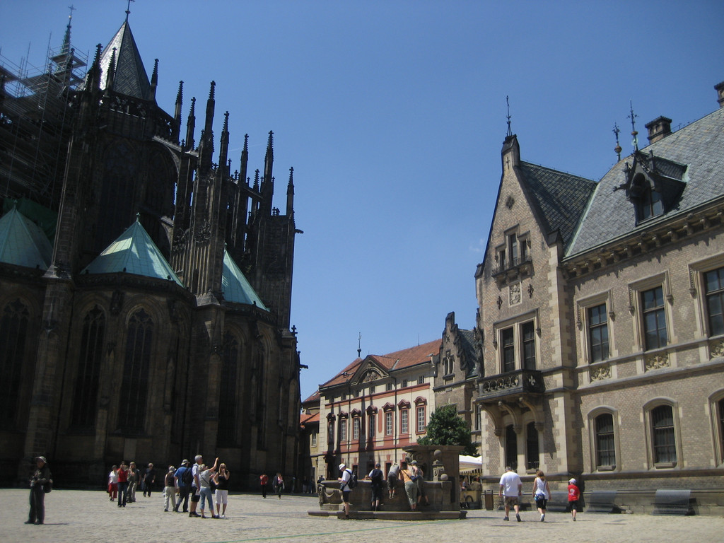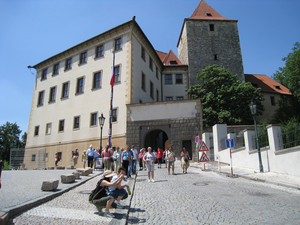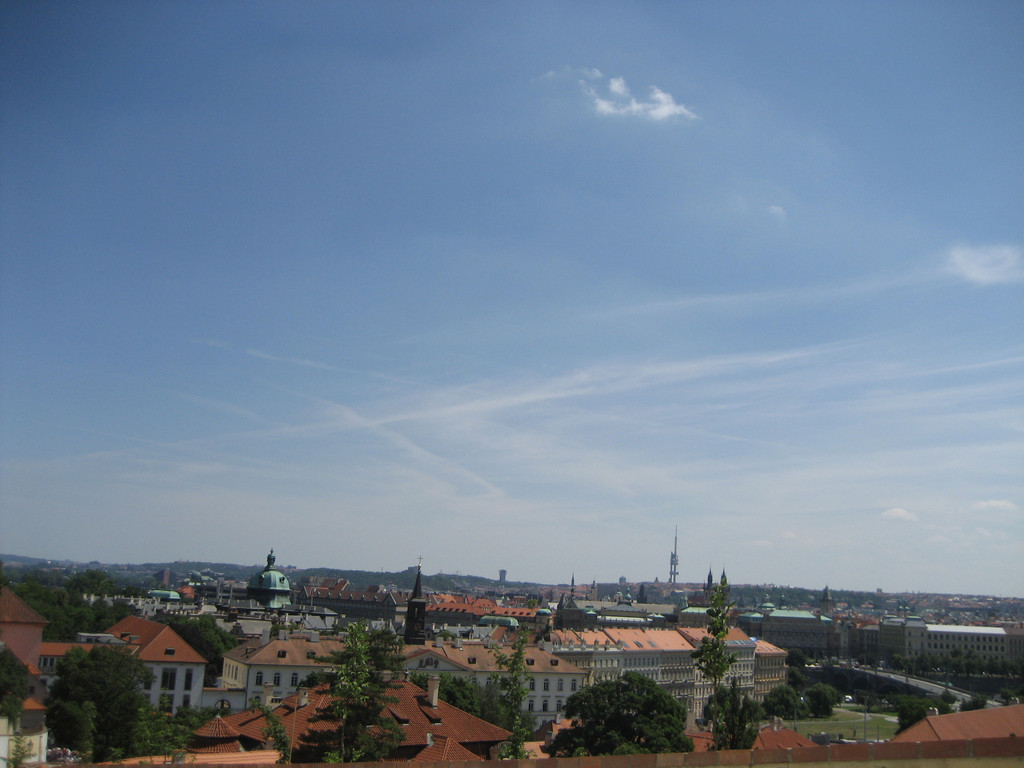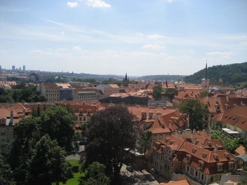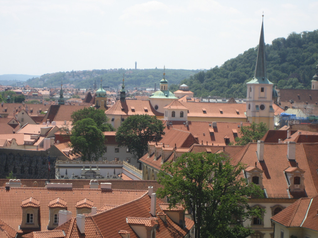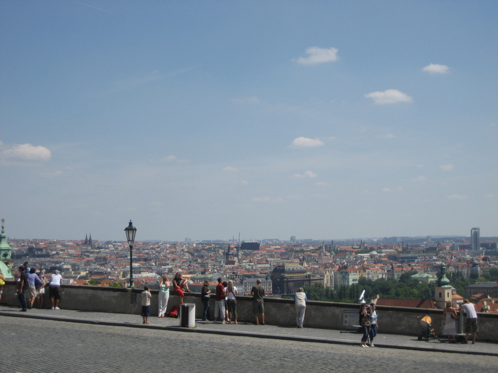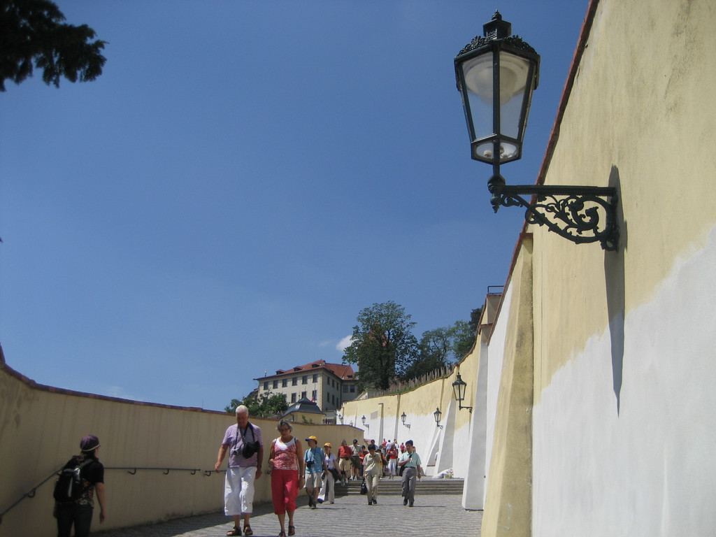 我們跳上的第一架巴士剛巧是可直達城堡的,於是順理成章地成為我們此行的第一站。斜波是進入城堡區的必經之路,遊人絡繹不絶。七月的布拉格,太陽一點也不馬虎, 頂著花花的大太陽, 沿途沒有一磚一瓦可以遮蔭,其實是頗吃力,但亦正正因此我們可盡覽牆外那片紅海,每個角度都可鳥瞰這座古城,布拉格著名的紅屋頂屋子在眼前展開,一直延伸開去,像一片無際的花海, 綠樹是點綴、塔頂是襯托,努力地圓滿別人為布拉格所塑造的第一印像。