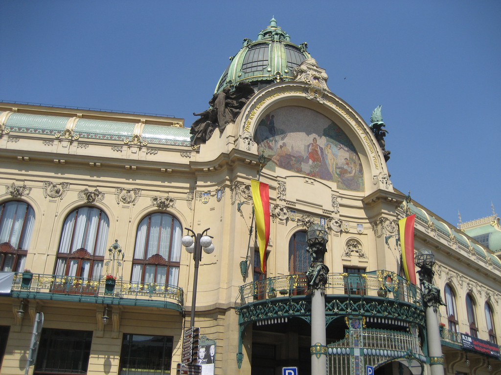 而與她為鄰的就是新市政廳,可以說是布拉格新藝術的經典代表作。這座屬於官用的聚會場所,牆壁以馬賽克磯磚拼畫,而樑柱、走廊和市政廰 一樓餐廳的設計,處處都顯出新藝術風格。