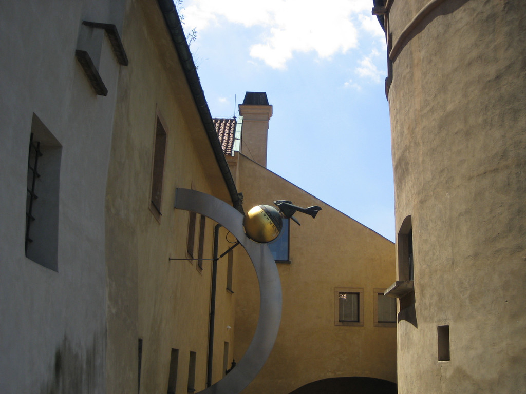 從喬治教堂旁邊往前走,拐個彎就到了聞名已久的黃金巷。黃金巷短短的,很符合它小巧可愛的形象,可惜已被觀光化了,裏面每個小屋都變成了商店,著名的卡夫卡之家也無一幸免地佈滿了遊人,吸引我的反而是在入口處正對面有類似盔甲、古代兵器的展覽館,館內展示各式各樣的古代盔甲,還有鳥的做型的盔甲。展覽館對外的牆壁,甚至還留有供弓箭射擊的小洞,想必這裏以前是防禦的堡壘之一吧!