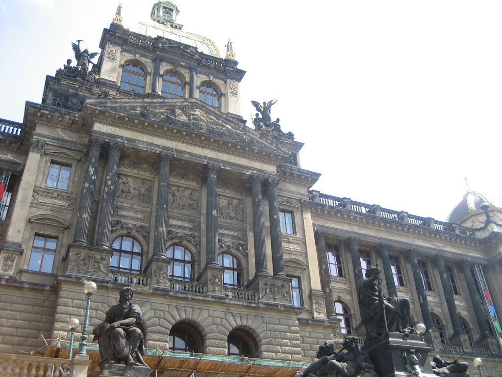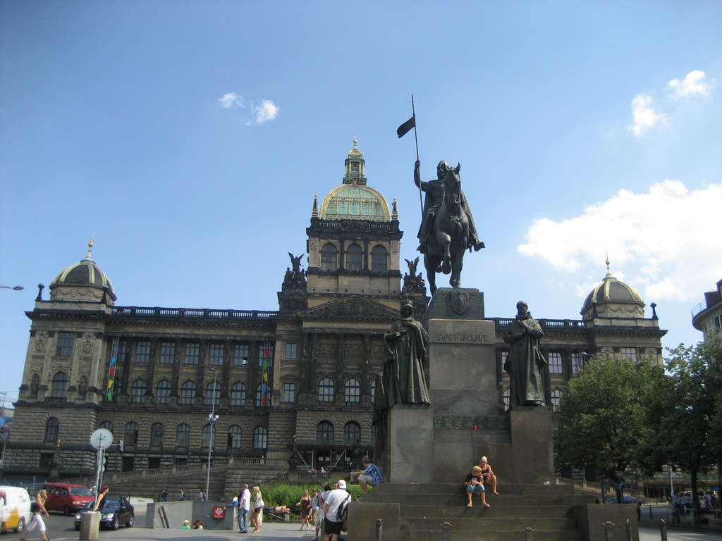 所以便來了這座位在瓦次拉夫廣場盡頭的國家博物館,這座新文藝復興式建築,是新城區地標之一。從國家博物館可以居高臨下將瓦次拉夫廣場盡覽,所以一整天都有遊人在台階上或坐、或站,這是我們在布拉格,遇見得最多人的地方,這裏聚集了不只是背著相機、拿著地圖的觀光客,也有一群群的青年人在追逐閙笑…這座博物館集歷史、文化於一爐,連礦物化石、動物標本、恐龍骨頭也可看到,有興趣者實大開眼界,我獨鐘愛館前的氣氛,而這座博物館外貎也甚有瞄頭,館門的兩側就有博物學跟歷史學之神的雕像。而圍著這座建築的設計又頗有藝術氣息,連環保垃圾箱也很精緻哩!