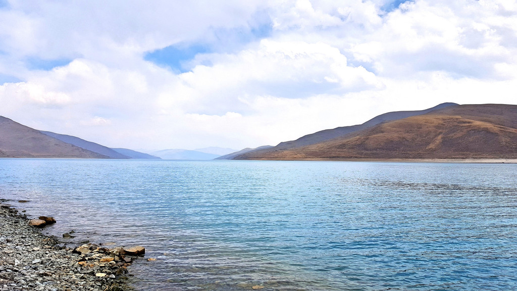 褐色岩石裸露的山体,一条蜿蜒曲折的黝黑公路,像一条腰线和谐完美地搭在了山体上,苍凉中蠕动着活力。羊卓雍错,三大圣湖之一,离拉萨最近。蓝色的湖水,褐色的山体,不知是谁装饰了谁!