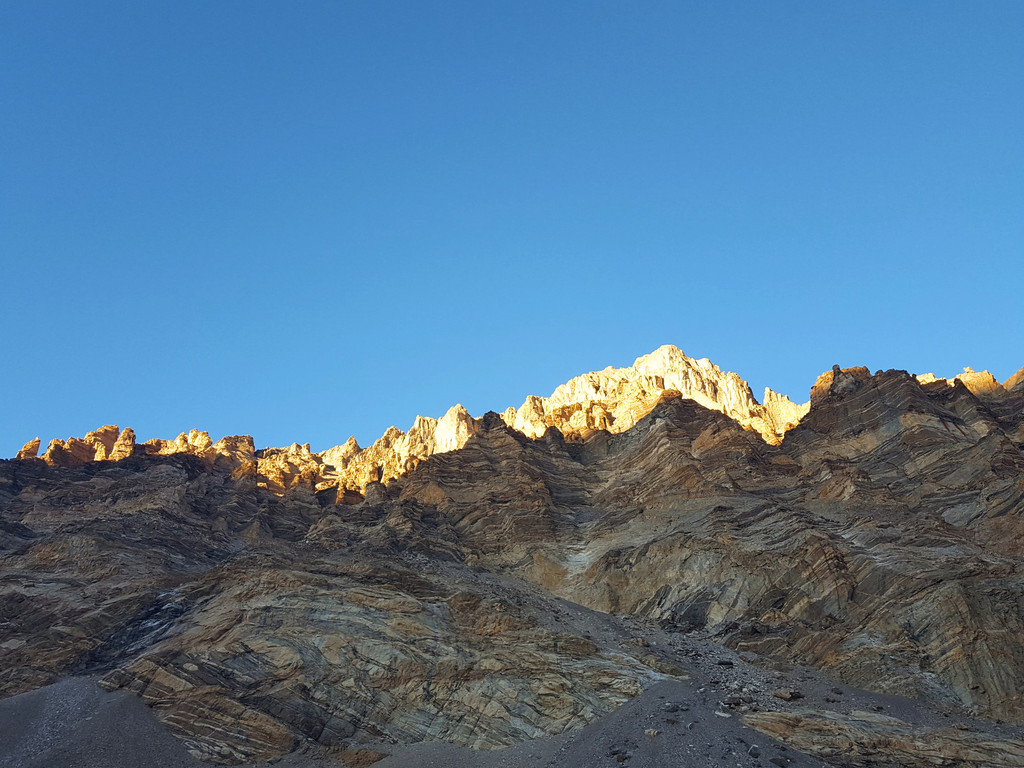 大家赶紧卸下行李,抄起家伙,分头寻找最佳位置,捕捉马上就要掉到山那边的落日。刚进帐篷的时候,还是整片的日照金山,待从帐篷里出来,只剩下鱼鳍一样的山脊,金光闪闪,像是镶了金边的化石。