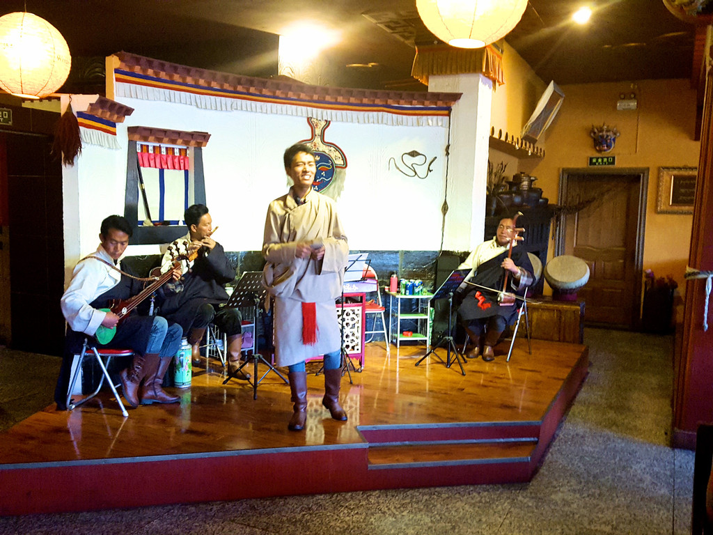 席间还有藏族歌舞表演。青稞酒度数不高,很好喝,像黄酒。糌粑做得很精致,不是藏族人用手抓着吃的那种,还是很好吃的。一路上同甘共苦,互助帮扶,革命友情大幅增进,最后这青稞酒一浇,更是点亮了这段激情燃烧的日子。
