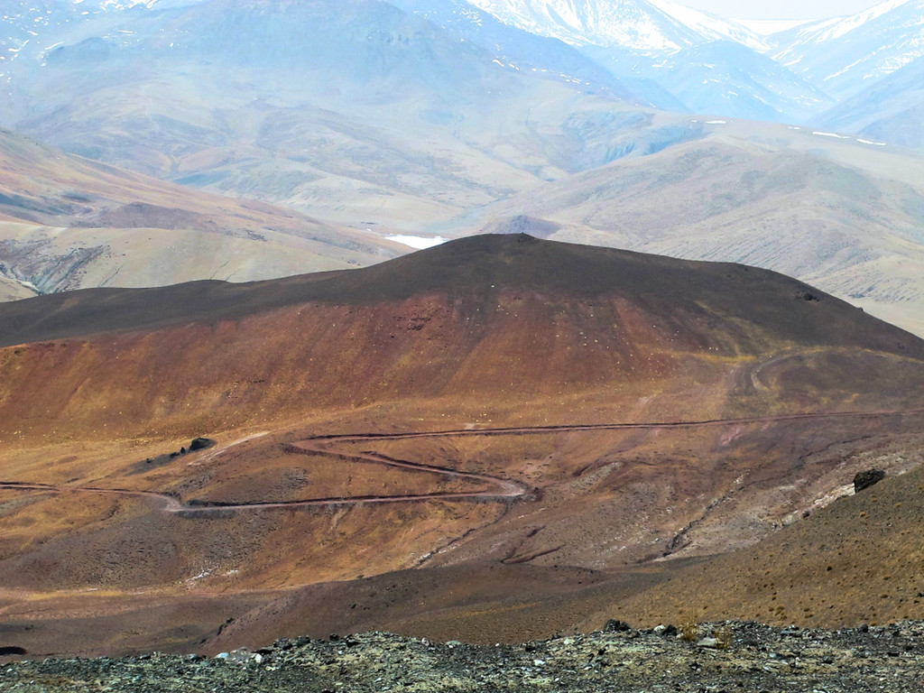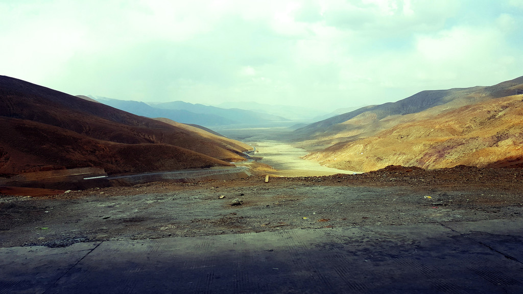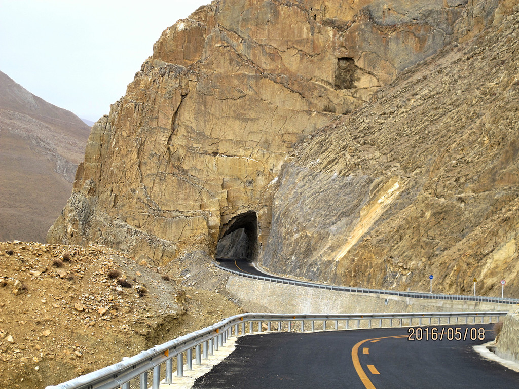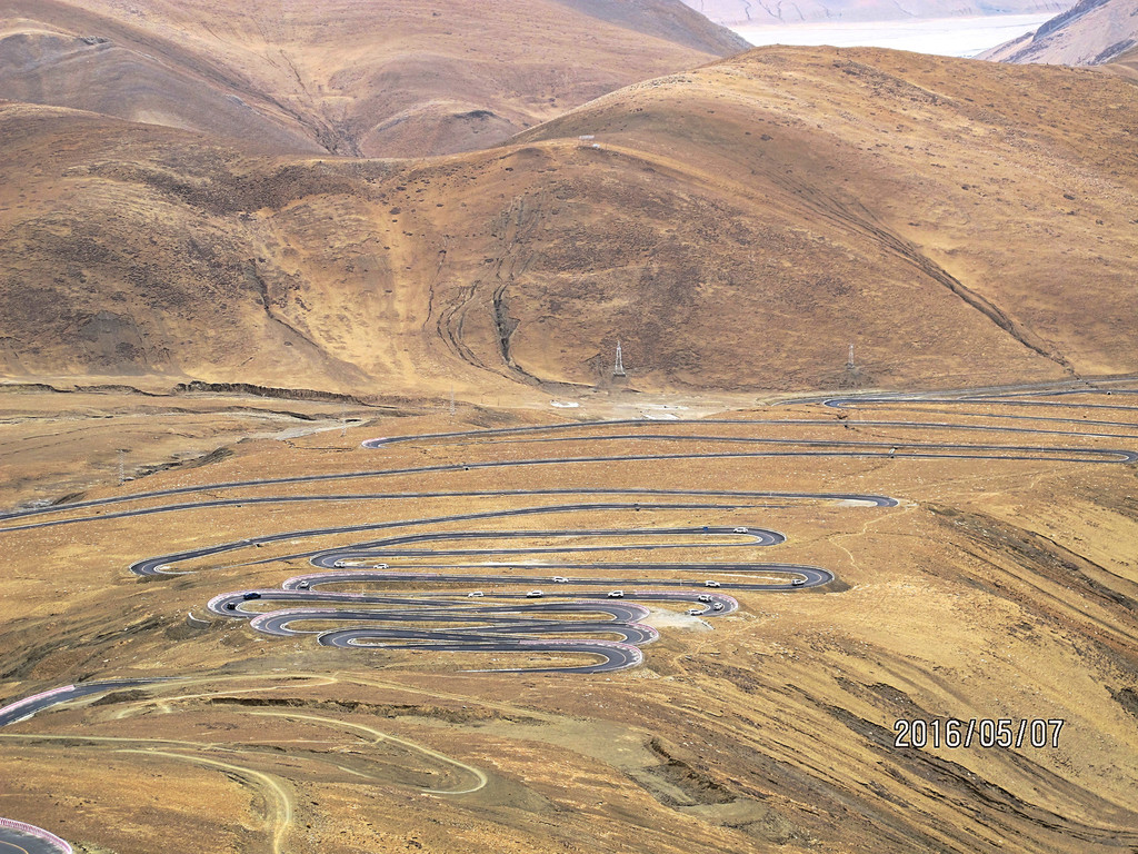 这也行,没异议了,大家重新又把注意力放到了两边的风景上。川藏线上的72拐,没去过,但在去珠峰的路上,经过的这一段盘山路,估计不会逊色于其它地方的各种各样的弯啊、拐啊的。简直是一幅油画,带梵高范儿的。画布平整,背景纯色的金黄色岩土,黑灰色的路,一环套一环,短短的几公里,一二十道弯,密度和角度,叹为观止。还没到珠峰,序幕都这么酷!