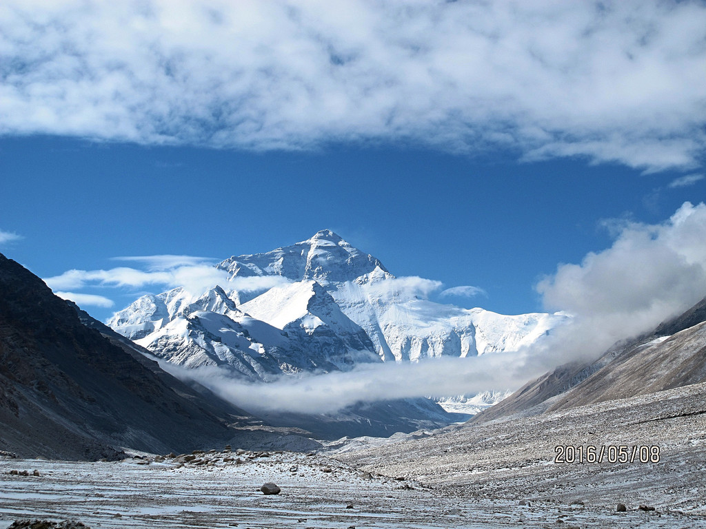 待到珠峰脱去最后金色的霞衣,我们亢奋的心情才平静下来,得以仔细端详雍容典雅、银妆素裹的珠峰真容。金字塔状的身型,将全世界仰望的目光,聚集成了她遗世独立的磅礴气场。