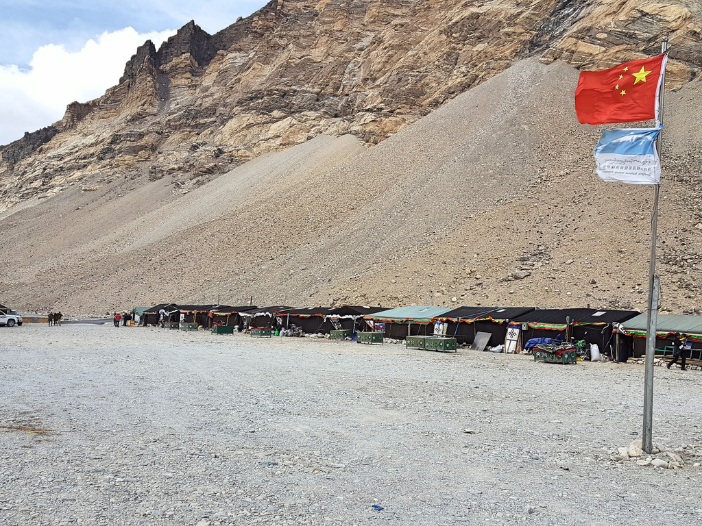 我们所在的帐篷区,其实是一个过渡区,将游人、车辆、旅游服务挡在了大本营的外边。真正的大本营还要乘营区的中巴再往里走5公里左右。既是到了那里,也不让我们进入那些正在集训,整装待发的帐篷区。一是需要登山证,二是要在登山学校(就是珠峰的登山服务商)报了名,统一组织才能进去驻扎。中巴司机带我们登上了一个大概二十多米高的小山坡,上面有两个藏族青年,一边帮游人悬挂经幡,一边照看着佛塔的香火。这里既能察看到大本营的状况,也能对珠峰做一次最亲近的凝望。对于我们这些到此为止的俗人凡客来说,只能望着大本营帐篷里胸怀梦想的勇士,心里酸溜溜地安慰自己,“虽然我不能登上去,但我用心触碰了珠穆朗玛”!