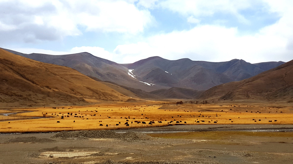 一路上常常可以看到牦牛,但我们分不清哪些是野牦牛,哪些是家养的。说是野生的吧,又看见草场时不时地被线网围起来;说是家养的吧,又看不见牧人,几乎在可视范围内看不到与这些牦牛有关的任何事物。