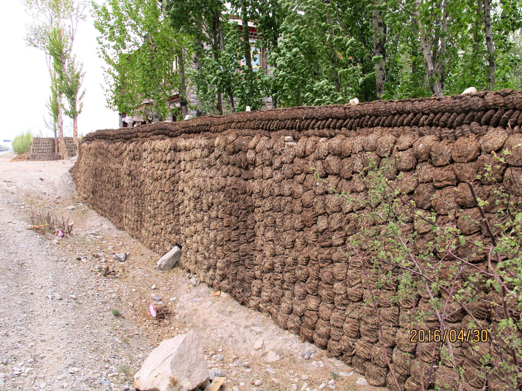 而燃料就是那黄灿灿,轻飘飘,珠峰脚下贵过油的牦牛粪。这牦牛粪可是高原上最高级的燃料,它质轻易着,热量高,一小筐要卖200块钱。偶尔在路边会看到整整齐齐垒起来的牛粪墙,也是藏区的一道独特景致。