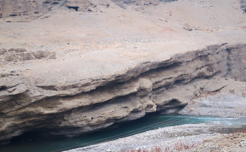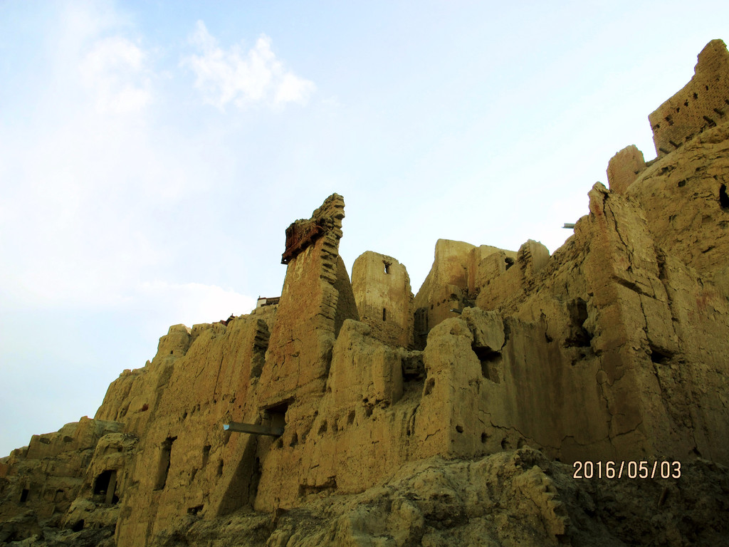 皮央遗址位于皮央村干涸的河岸高地上,沿着绵长陡峭的山崖一字排开,是一处由寺院、石窟以及城堡组成的大型遗址。皮央最为显眼的是其庞大的石窟群,布满整个山崖,洞窟的数量号称“前山一千,后山一千”。皮央与东嘎隔河而望,各自镇守两岸,感觉历史上他们应该是死对头的两个部落。但从遗址和壁画来看,他们似乎是一个有着同样宗教文化、文明体制的城池,就像现在的很多城市一样,有一条著名的河流穿过。这跟我们看见的情形也一致,进入皮央村时,村口竖着“皮央”的牌子,但走进去后,发现村民家的大门上钉的却是“东嘎村xx号”的门牌。