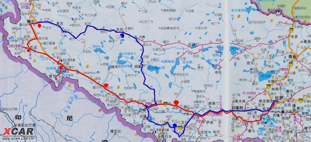 我们的行程见上图,红线去,蓝线回。在拉萨呆了两天,游览布达拉宫、大昭寺,准备后勤给养,适应高原环境,等待后到的同伴。第三天就雄赳赳地出发了。首先直奔羊卓雍错,经卡若拉冰川、江孜,夜宿日喀则。第二天过拉孜,夜宿萨嘎。第三天见到了冈仁波齐和玛旁雍错,夜宿普兰。第四天穿过土林,游览古格遗址,夜宿札达。第五天专门绕道寻访了东噶皮央的壁画,夜宿阿里行署所在地,狮泉河镇。第六天掉头返程,搓板路上蹦跶了一天,夜宿改则。第七天又蹦跶了一天,傍晚时在措勤终于盼到了柏油路,夜宿桑桑镇。第八天过定日,夜宿珠峰大本营。第九日原路返回,宿日喀则。第十日走318国道回到拉萨。然后购物、逛街一天,第二天各回各家。