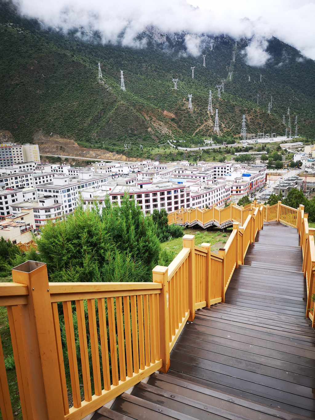 早餐有酥油茶、包子,按需自己取,鸡蛋只一个(可以理解,据说高原的鸡不下蛋的)。餐后,K公一家还未起床,就携自家“小主”出去转了转,发现后面山上有健身步道,上去可俯瞰左贡新区。