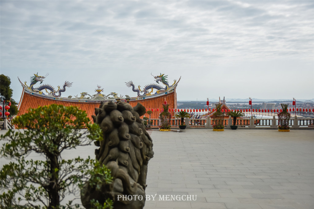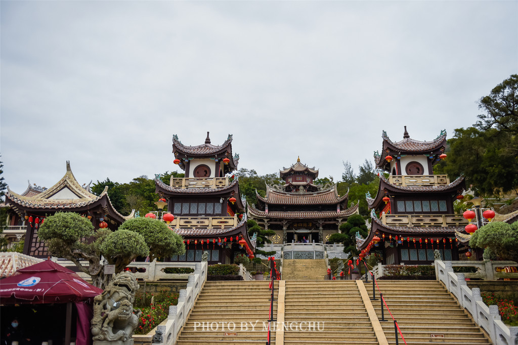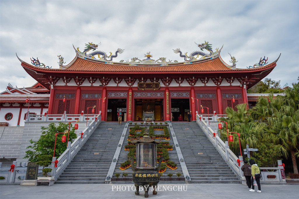 作为全世界华籍海员顶礼膜拜和海内外同胞神往的圣地,湄洲妈祖庙建筑群以前殿为中轴线布局,依山势而建,形成了纵深300米、高差40余米的主庙道,从山门、仪门到正殿由323级台阶连缀两旁的各组建筑。现存建筑多为清代结构,雕梁画栋,金碧辉煌。在祖庙山顶,还建有14米高的巨型妈祖石雕像。