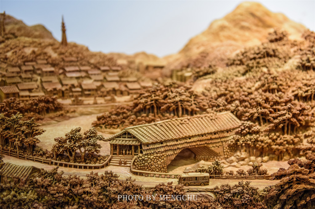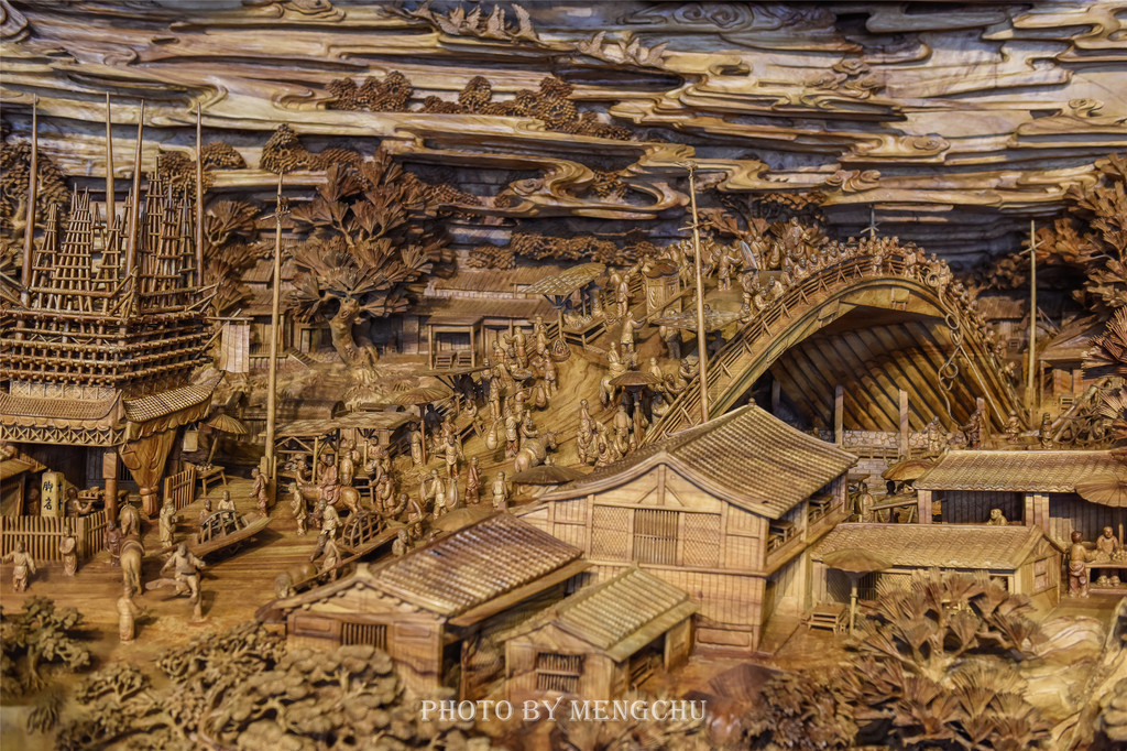 郑老师的艺术馆中,有许多令人叹为观止的木雕艺术品!由花梨木雕刻的《百龙图》,刻画了一百条不同动态的龙的形象,象征着中华民族坚韧不拔的奋斗精神和蓬勃生机;长达12米的《千里江山图》,由台湾阿里山桧木雕刻而成,根据宋代王希孟的长卷山水画《千里江山图》而作,以木雕的形式生动立体地展现了画家笔下千里江山雄伟辽阔的壮丽景象!还有入选了吉尼斯世纪记录的《清明山河图》,是至今世界上最长的木雕作品,正面为宋代张择端的版本,融合了莆田传统的镂雕、透雕、浮雕和精微透雕的雕刻技法;背面为清宫画苑版本,以浮雕为主要手法雕刻;两者合并于一颗千年樟木上,寄意着两岸的文化交流和精神价值的传承。