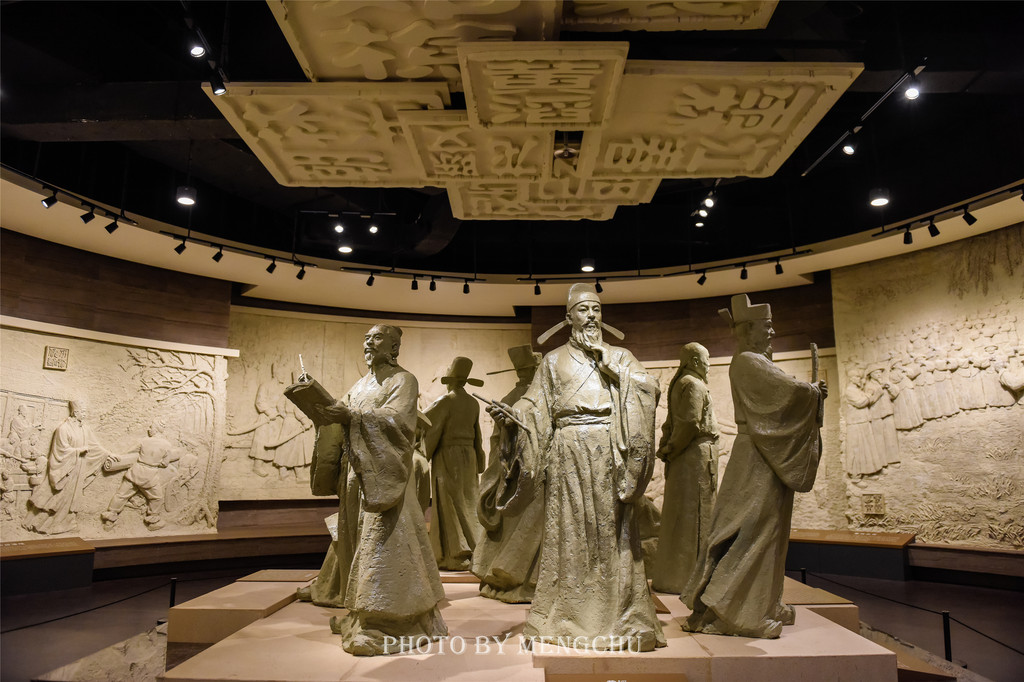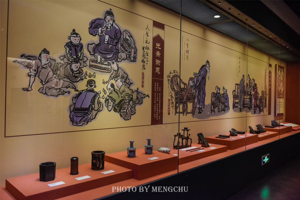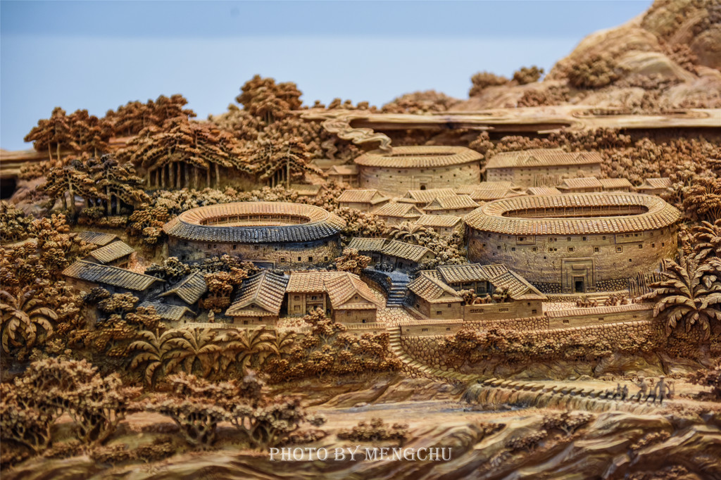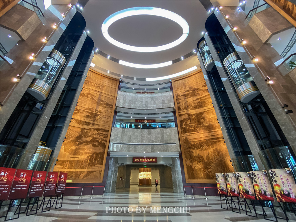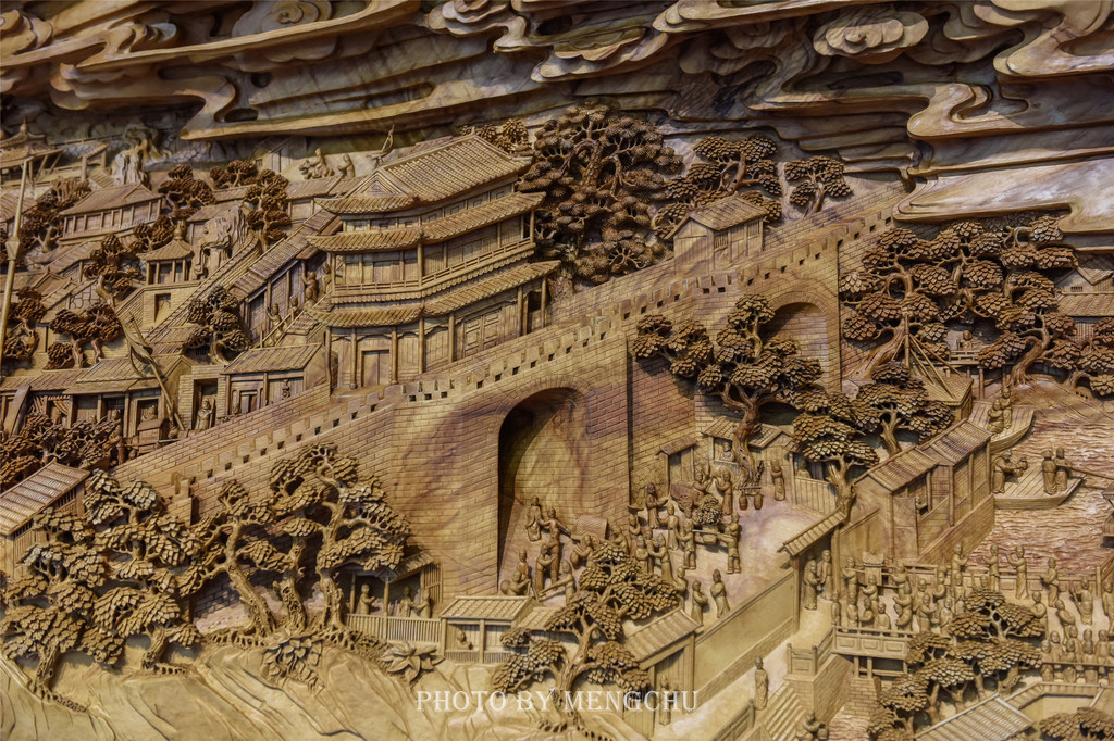 走入馆中,首先映入眼帘的是四副巨型木雕作品,开门见山地展示了莆田的木雕工艺。这4幅木雕作品约有五层楼之高,以莆田历史、人文、景观为雕饰主题,分别是《壶兰雄邑》、《文献名邦》、《妈祖故里》、《荔林水乡》,每一幅作品都大量包含了莆田元素,全面重现莆田悠久的历史、辉煌的人文,它们似一本本莆田历史教科书,精妙绝伦地娓娓道来;远观大气恢宏,近看浮雕细腻,栩栩如生,令人叹为观止!