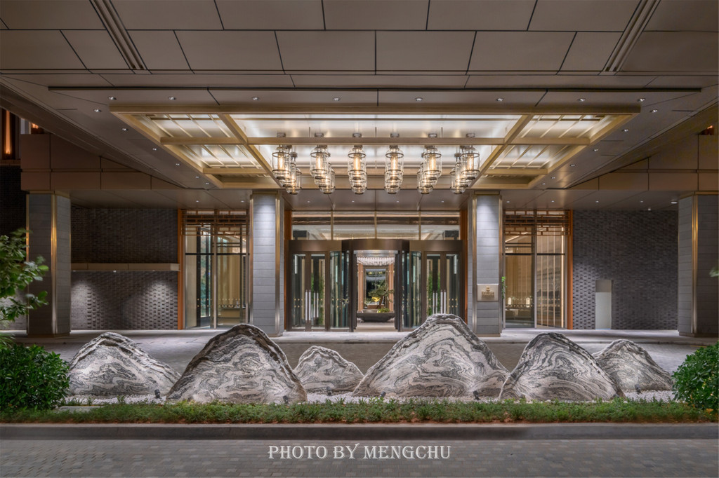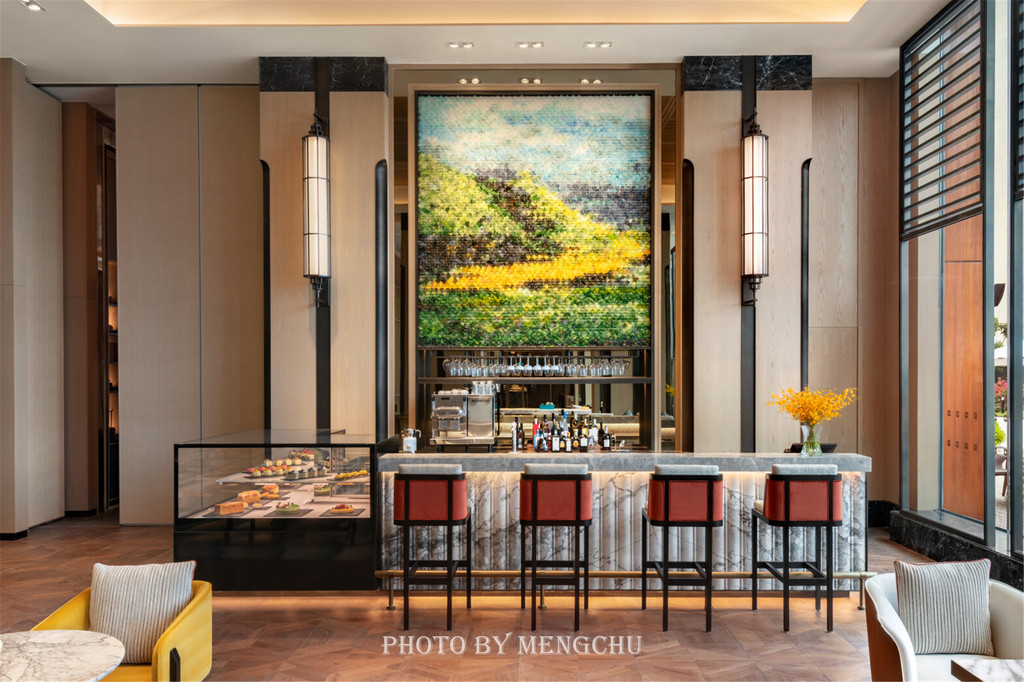 莆田香格里拉大酒店以“学子归来”为主题构建酒店的空间格局,处处可见其对当地文化与历史的致敬。酒店楼体外墙采用闽系建筑中的红砖灰塑为主色调,与周围景观和谐融为一体,内饰则大量采用地域性特色元素,如莆草、藤条、木雕等。 酒店入口处以一排高低错落的石头和天然石纹刻画出的层峦叠嶂,象征着莘莘学子跨越千山万水后回到家中;大堂正中心的现代装置艺术“飞燕尾脊”及水池中的绿植,以福建大宅园林的形式呈现大堂,营造“家”的感觉;而装饰细节如豪华阁酒廊里的文房四宝及墙壁上石刻的古诗词句,无不体现莆田曾经作为“文献之邦”名闻天下的辉煌历史。从前台背景墙用4,352片碧绿陶瓷方锭平铺而成的茶园图案到大堂酒廊里用五彩茶叶包排布出的莆田梯田风光,从豪华阁酒廊里陈列的文房四宝到公共空间墙壁上石刻的古诗词句,再到电梯厅里用彩色棉线在麻布上绣制的打渔场景,以“茶”、“科举”和“水乡”为主题的艺术品和陈列摆件随处可见。