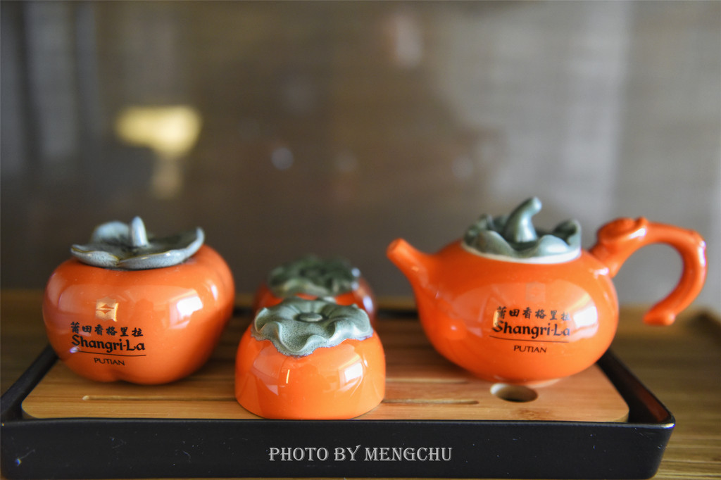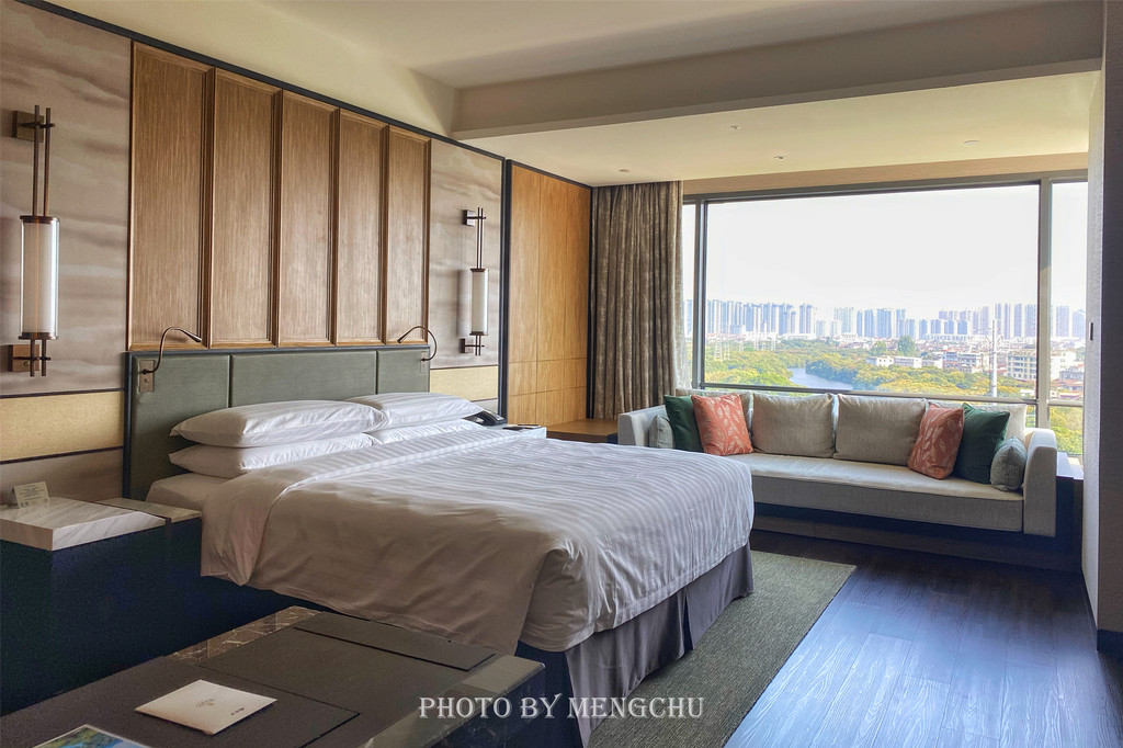 酒店的豪华客房,全部配有全景落地玻璃窗,视野开阔,将郁郁葱葱的绶溪公园、缓缓流淌的绶溪河和千年古桥等美景尽收眼底,青山绿水间不时可见白鹭浅飞,景观赏心悦目。新中式风格的客房与酒店整体设计一脉相承,采用本土原材料及手工艺,并融入了莆田特色的装饰和细节设计,包括灵感源自蒲草的绿色编织图案;而大面积的实木墙面装饰,则在现代东方简约的造型下隐藏着莆田原创的木雕技艺。 在客房用品和功能配置上,莆田香格里拉在房间放置福建特色的功夫茶具,为客人带来浓郁的茶文化和莆田功夫茶的冲泡体验。