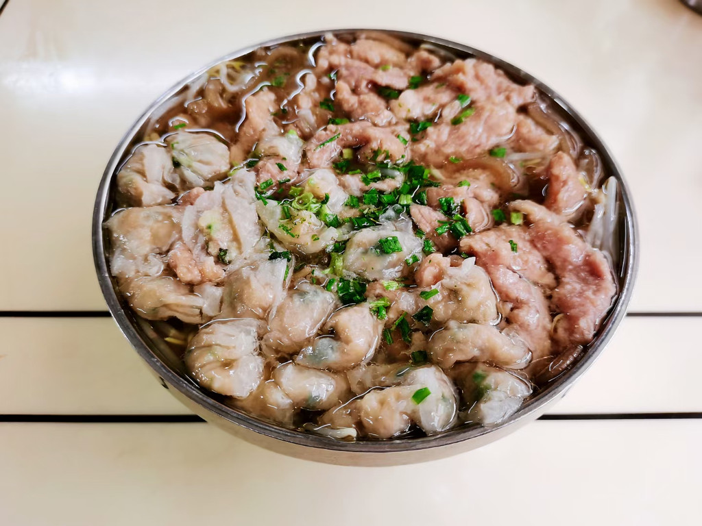 朋友介绍去一家叫XXX扁食卤肉的店,但找了半天,问了很多路人都不知道,最后碰到一位带孩子的妈妈带我骑了一段,终于找到了那家店,就在一所中学的斜对面(不记得那所学校的名字了)。店里生意还不错,不少当地人在里面吃饭,点了一份炝肉扁食泗粉汤(CNY20),第一口吃上去觉得有点油腻,加点醋可以解腻。