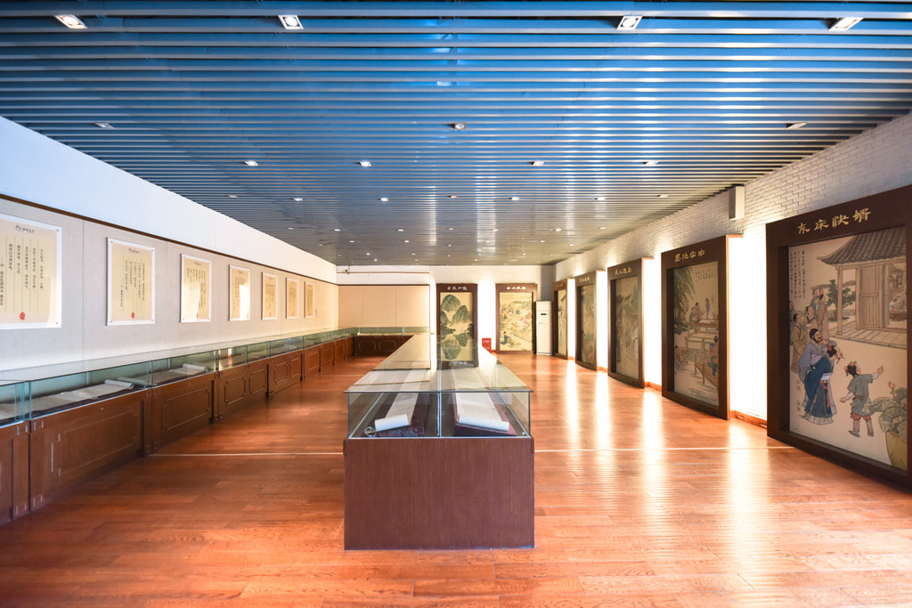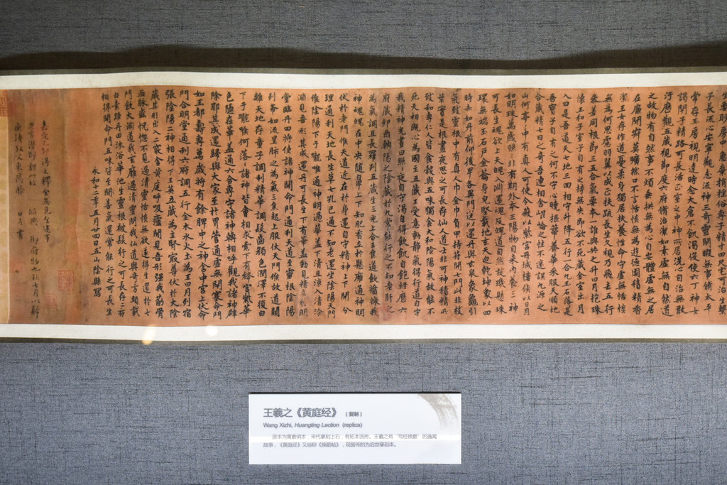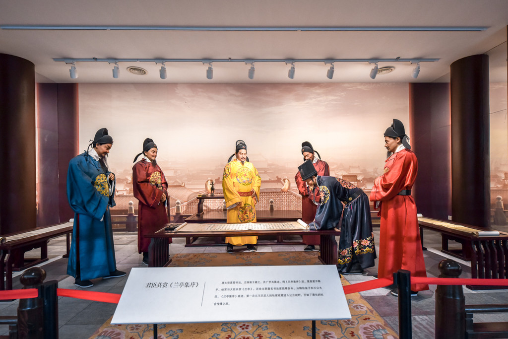 门厅左边,是王羲之生平事迹和书法作品展厅,这里按照时间脉络依次展现了“东床快婿”“初到会稽”“临池爱鹅”“题扇躲婆”“戒珠失友”“兰亭雅集”“金庭归隐”这几个历史场景。展厅搜集了存世最全的王羲之书法作品。