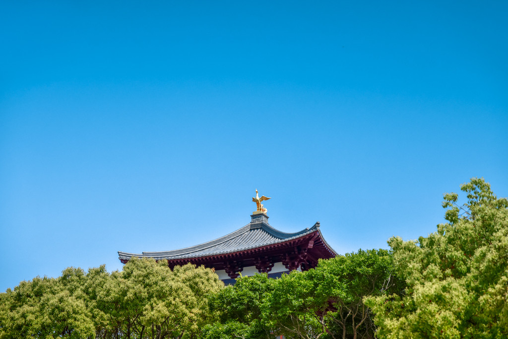 随岛上主干道的林荫步行道,一路折返,就到达法雨禅寺。法雨寺又称后寺,初名海潮庵,清康熙三十八年(1699年)赐“天华法雨”额,遂称法雨禅寺。建筑布局依山取势,分群递升。其中九龙殿最为辉煌,该佛殿是从南京明故宫整体搬迁而来的,殿内有普陀山三宝之一的“九龙藻井”。