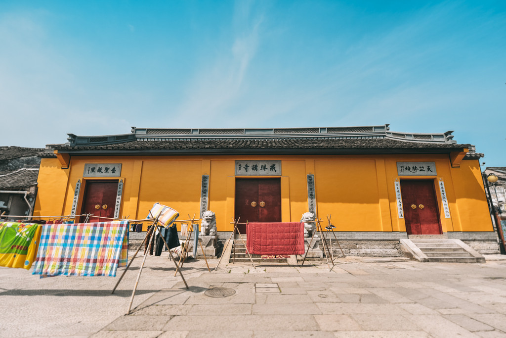 在古代,只有皇家只能御用黄色之物,而佛教寺院庙宇却尤为特殊。肃穆,端庄,尊贵,无上。满墙爬山虎,密密麻麻循着庙墙而上。我国多有深山藏古寺之地,比如佛教道场九华山一般,寺院庙宇,目之所及都有;而普陀山却尤为特殊,毕竟是海上蓬莱,海天佛国。春日时节,阳光明媚之日,让庙宇更显得神圣。