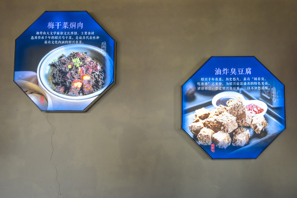 如今咸亨酒店,依托鲁迅笔下的情结与绍兴美食的特色,成为了中华老字号品牌餐饮。店堂内,也是八仙桌为主,特色菜肴以绍兴菜为主。