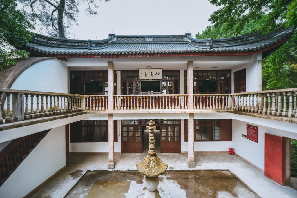 山庄为中西合璧,大门内两旁平房各1间,平顶晒台。天井后3间2层楼房,总建筑平面或物体表面的大436平方米。楼上洋灰走廊与晒台相连,芳草绿树环回萦绕,青山碧水拥来眼前,赏心悦目不足言其妙。堂内吊挂着多帧蒋某人与宋美龄的旧相片,却不见这一幅“霸王别姬”似的“仓皇辞庙”窘态。妙高台左有伏虎洞,右有消凡台,前有晏坐台等,均为宋高僧知和禅师遗迹。