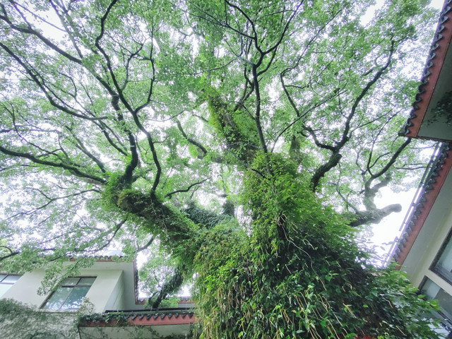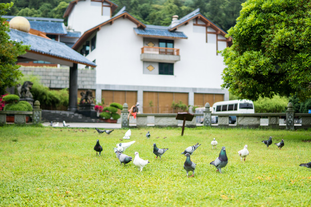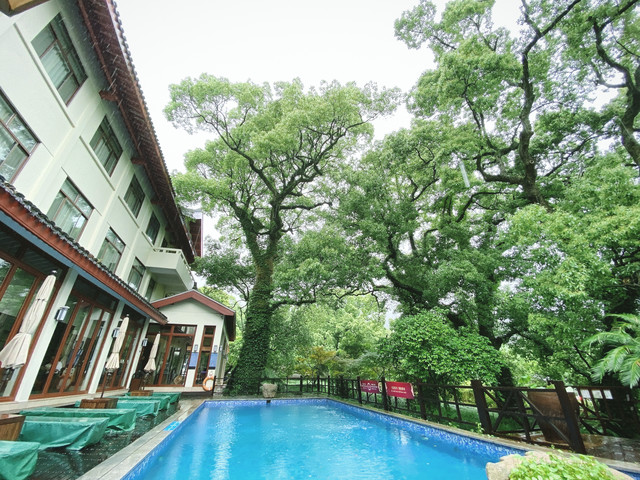 然而,走到后院,又是另一番景象。后院紧靠西天景区,绿草如茵、林木葱郁。一座座充满禅意的客房,依山而建。住在这里,真的太有味道了。