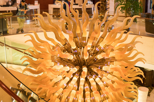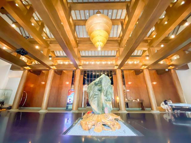 从踏进门的那一刻,就感受到如易阁浓厚的佛教气息。古色古香的装修风格,充满禅意的布局,瞬间能让人内心平静下来。进门的大堂,名为碧莲灯堂,堂中央矗立着一块雕刻着三朵莲花的硕大昆仑碧玉。