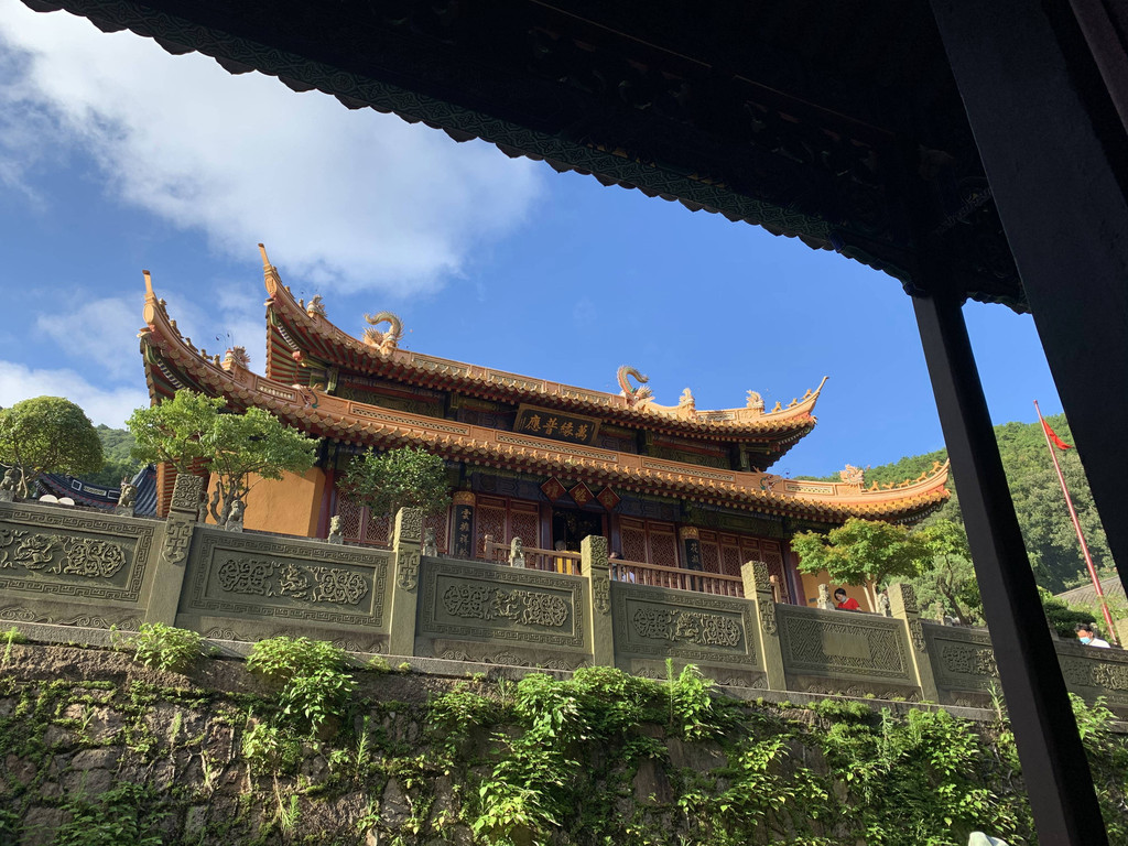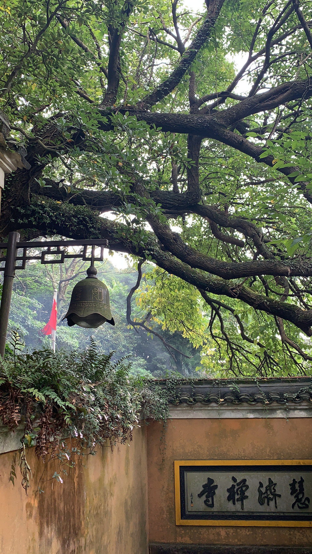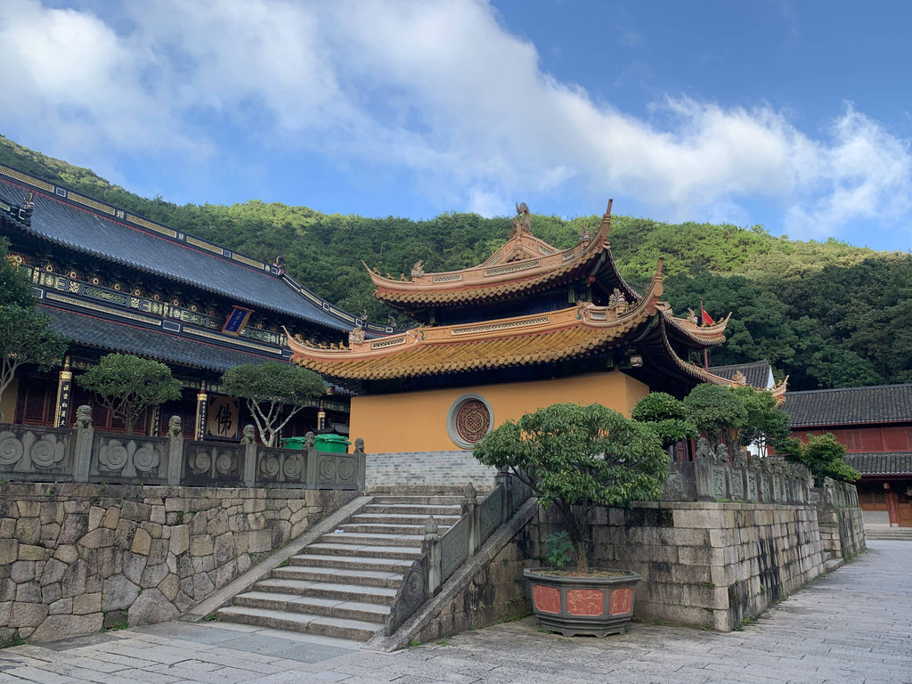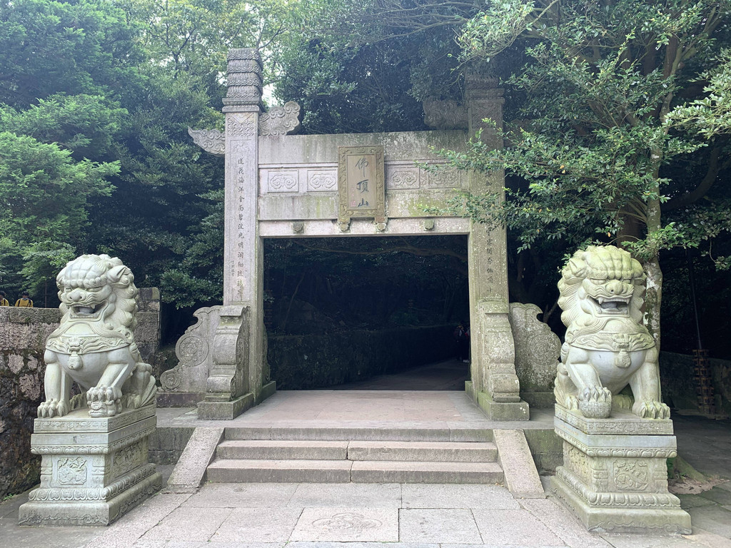 较之法雨寺的美轮美奂,山顶的慧济禅寺寺则是一派古朴淳厚的风格,青苔和微微潮湿的地面终年有虔诚信徒的三跪九叩、爬山虎静静悬停在经历了岁月的山墙,两座石狮静静蹲守山门,古朴的山门仿佛可穿越到仙人的居所;
