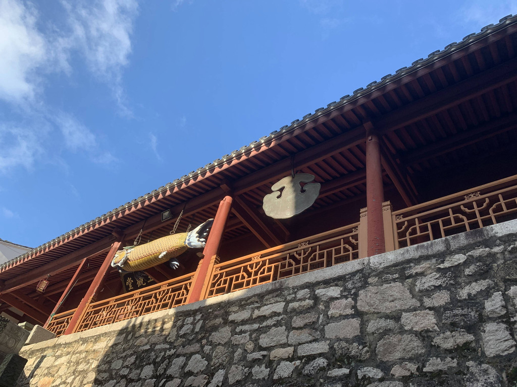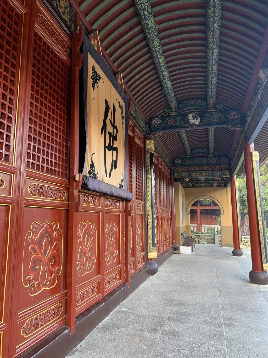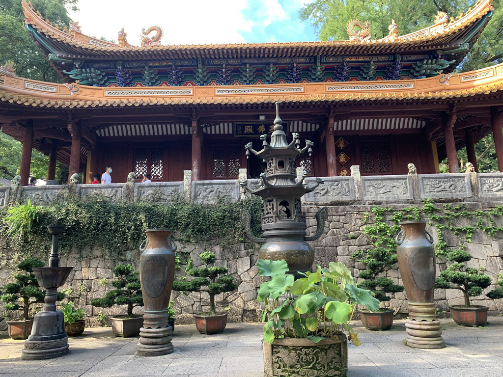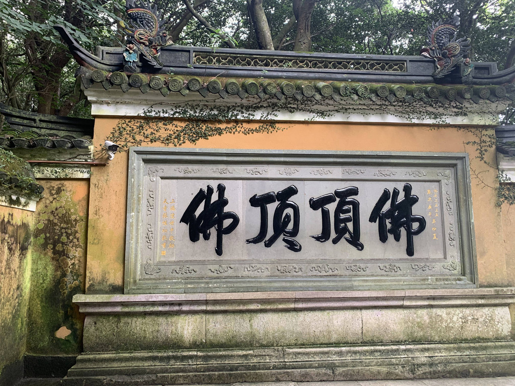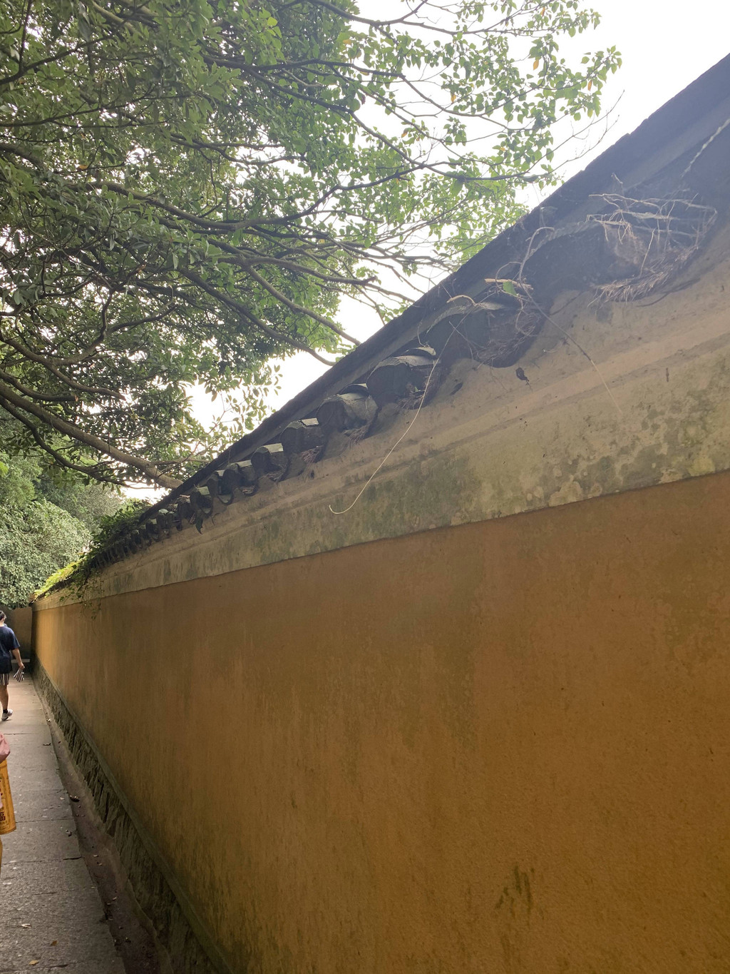较之法雨寺的美轮美奂,山顶的慧济禅寺寺则是一派古朴淳厚的风格,青苔和微微潮湿的地面终年有虔诚信徒的三跪九叩、爬山虎静静悬停在经历了岁月的山墙,两座石狮静静蹲守山门,古朴的山门仿佛可穿越到仙人的居所;