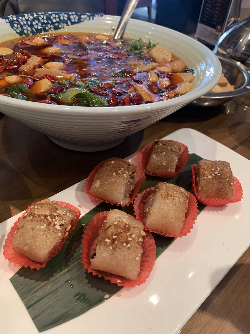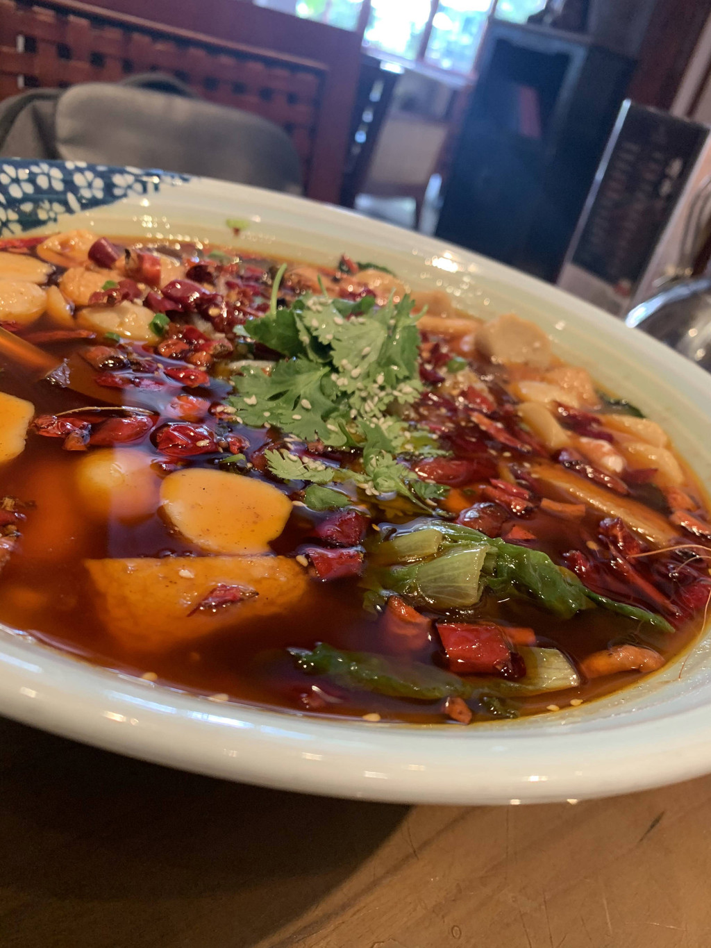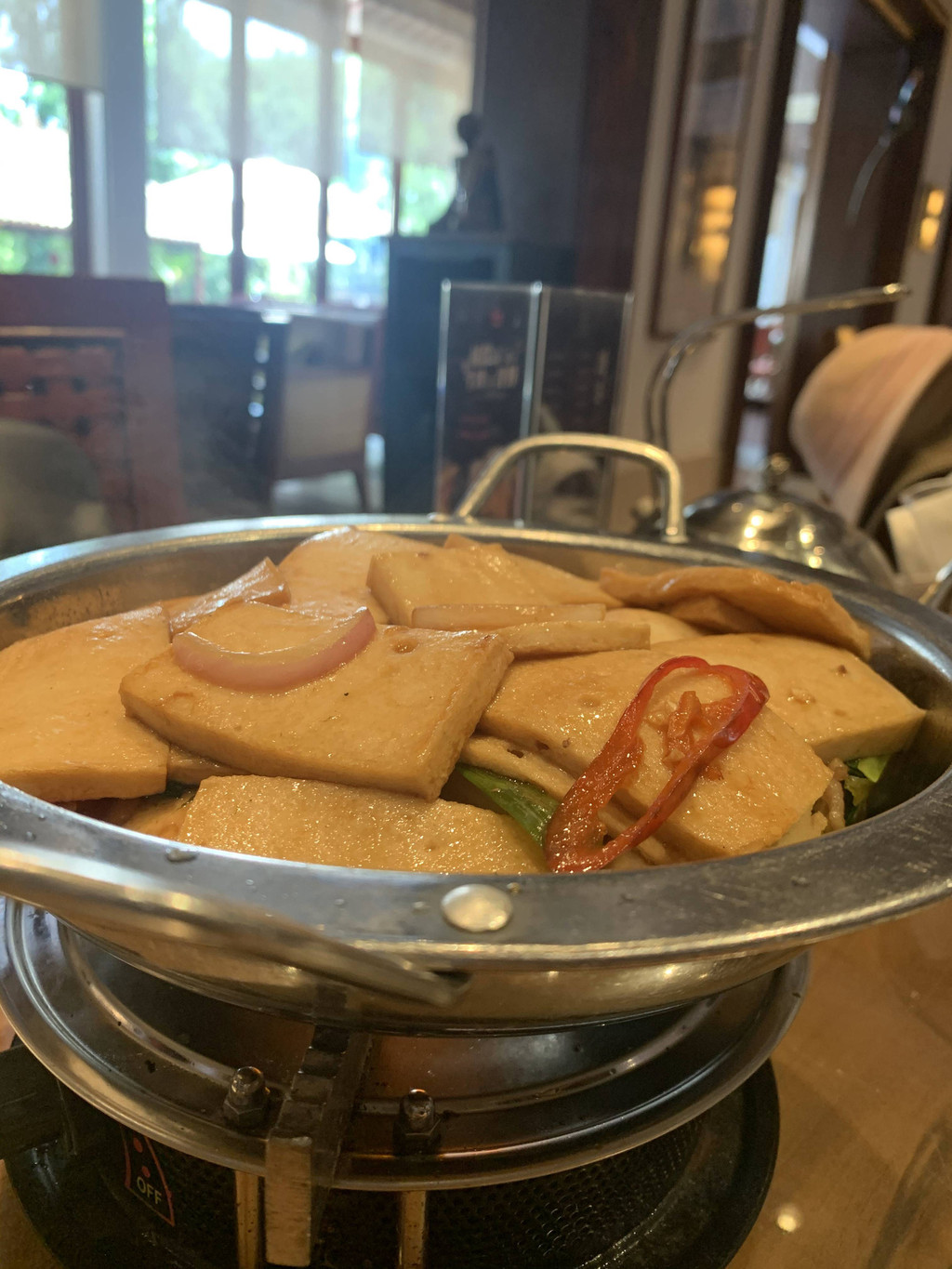 雷迪森的“莲“和对面开元酒店的餐厅都有很不错的素食,近期在普陀山也有一些活动出镜。因为住在雷迪森,还是选择了雷迪森的”莲“。这边下午茶是特色,古朴幽雅,可惜来了才看到,没来得及排进日程,希望下次有缘分;正餐有一个海鲜毛血旺似乎点单率很高,这次尝试了一下,感觉味道不错,尤其是炎炎夏日又吃了几天清淡饮食后,这一口鲜美的辣汤还是很提神,但是小小的意见是:重复的菜品太多了。毛血旺讲究的食材丰富,但是这一盘里,大多是鱼丸,有点单一;还有值得一提的是:这边的疙瘩汤、面条之类的主食,小份是两三个人的量,大份是五六个人的量,万一客人独自前来,要一个人吃有点辛苦啊。